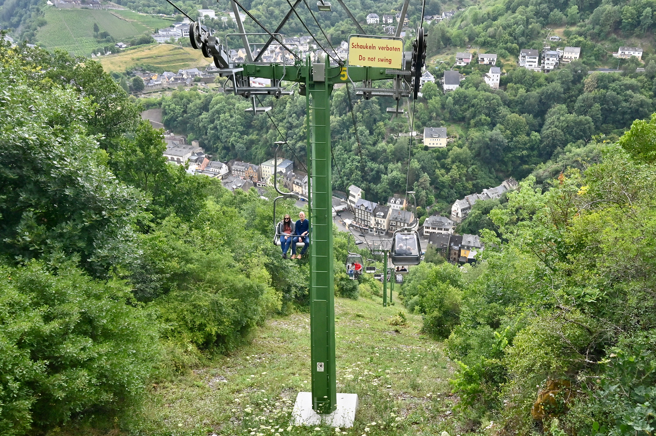 Wir haben die Wahl, uns Cochem von oben anzusehen – Reichsburg oder Pinnerkreuz. Wir brauchen mal etwas anderes als „Burg“, deshalb geht es mit der Sesselbahn rauf zum Pinnerkreuz.