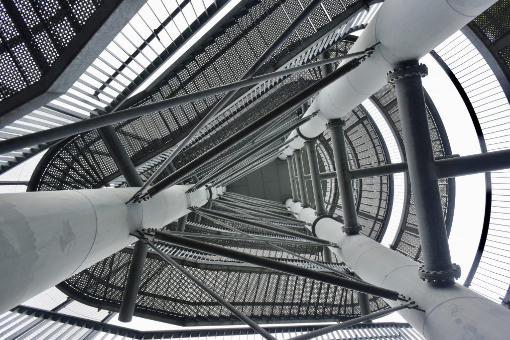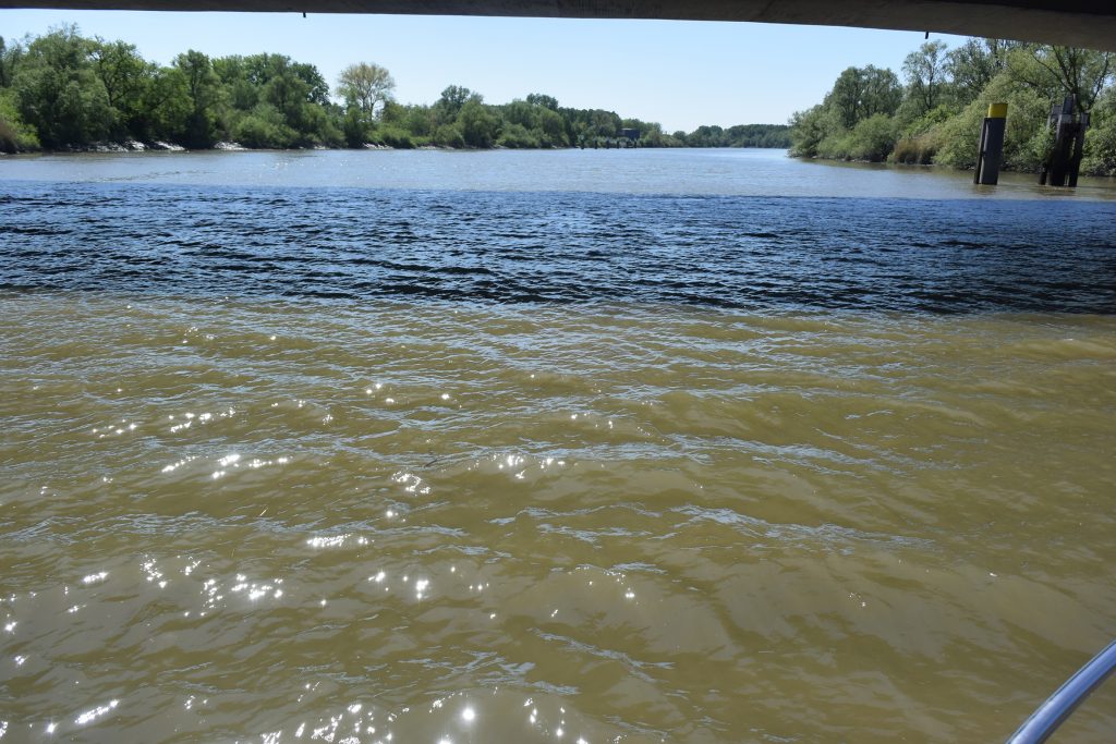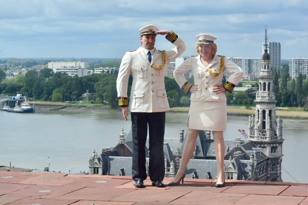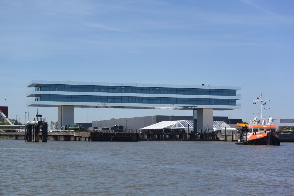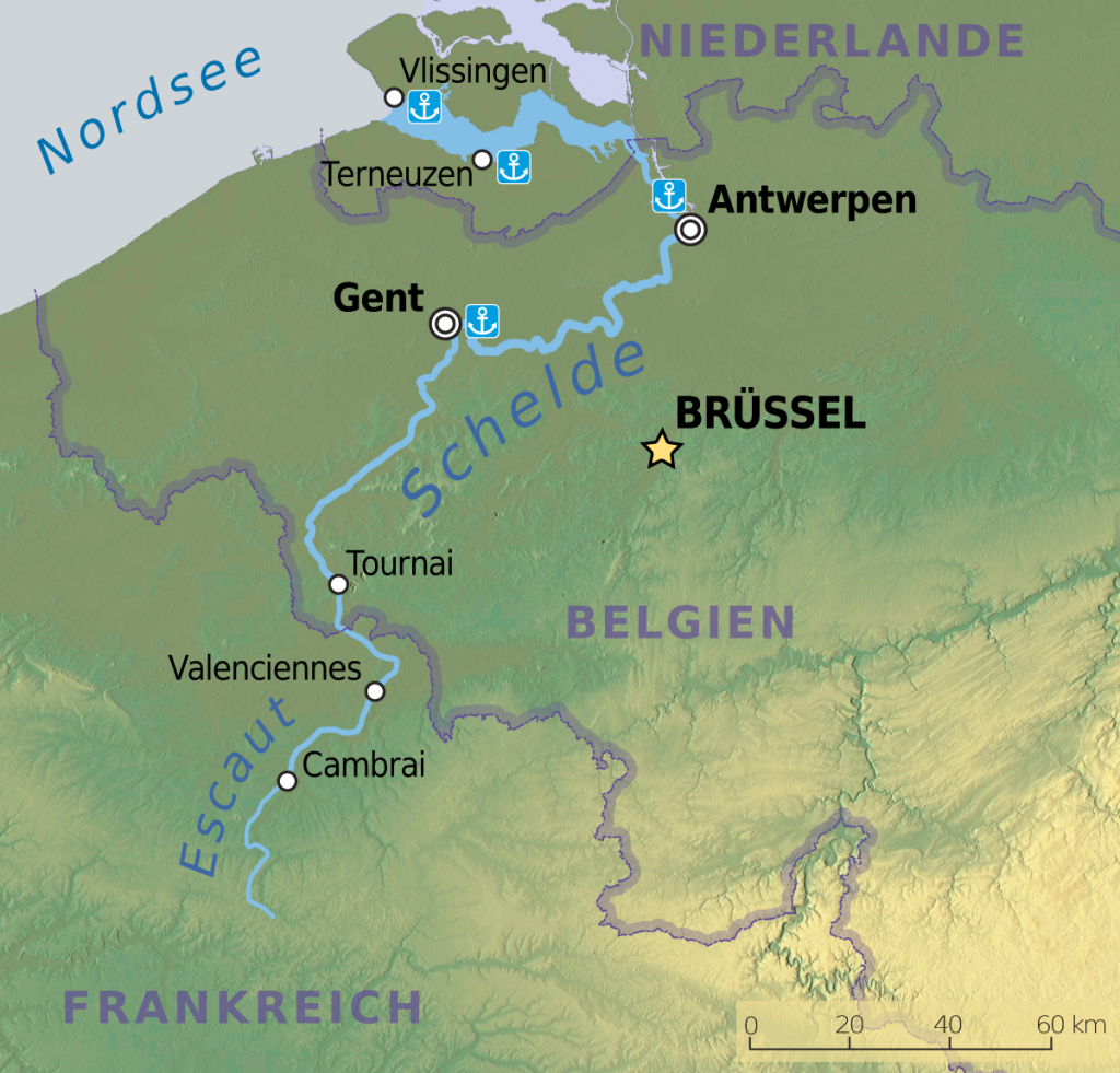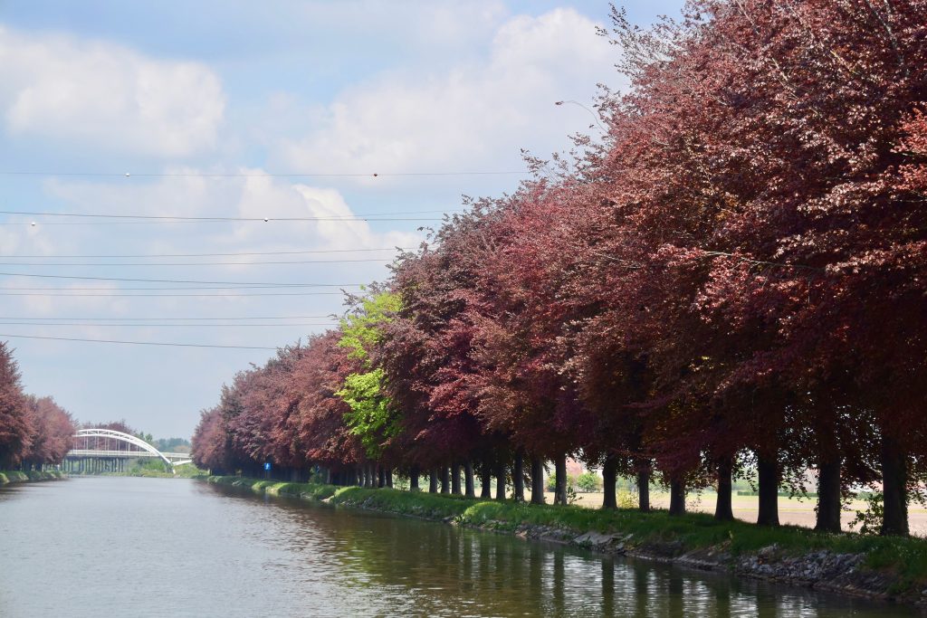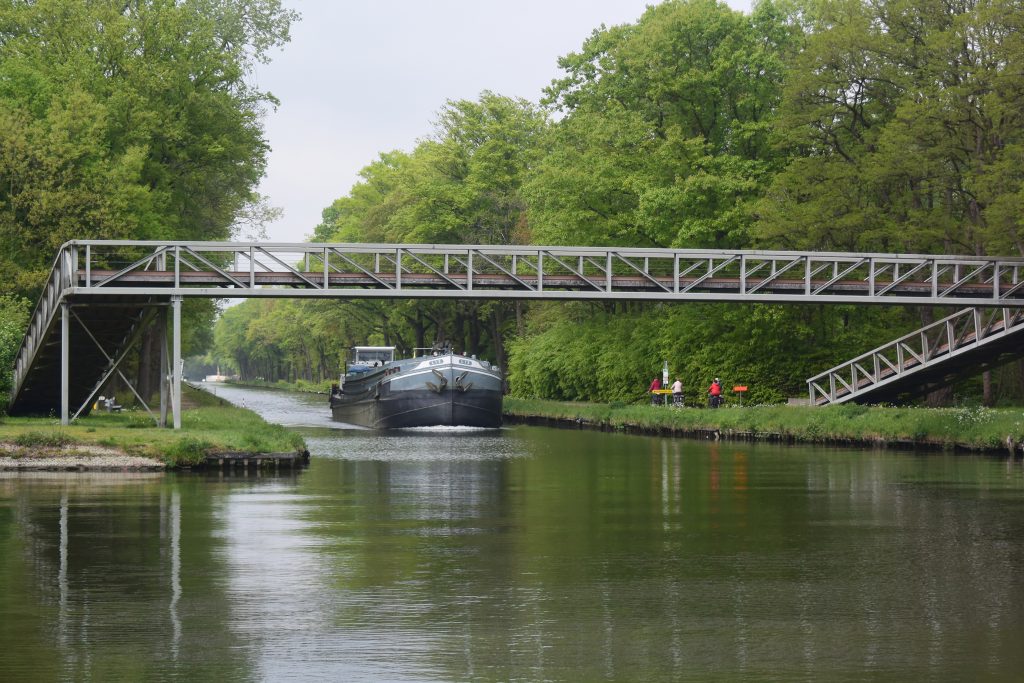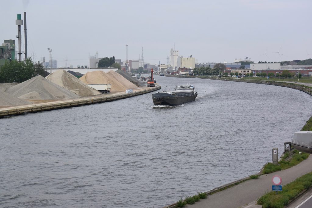 Wir unterbrechen unsere Fahrt am Wasserstraßenkreuz bei Dessel. Na klar, ein Aussichtsturm ruft nach Besteigung. Die Weiterfahrt auf dem recht schmalen Dessel-Schoten-Kanal führt fast nur durch Waldgebiet. Schön, aber auf Dauer ein bisserl langweilig. Bei einigen entgegenkommenden Frachtern wird es auch ziemlich eng.