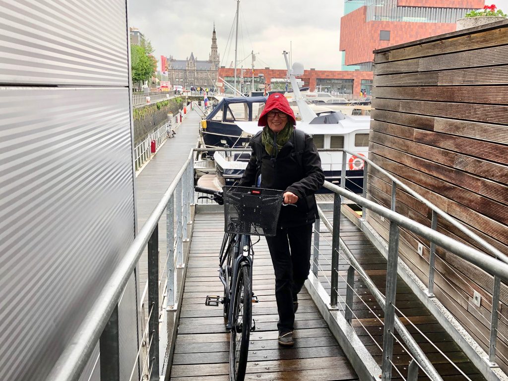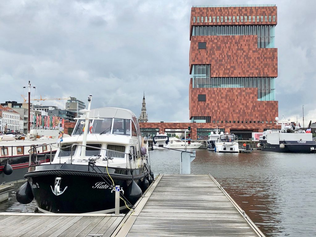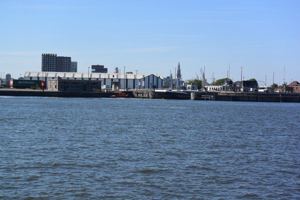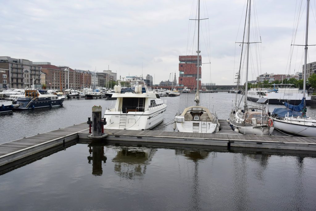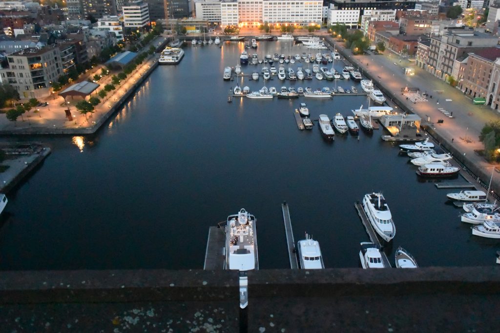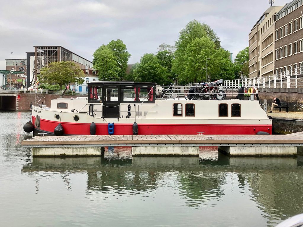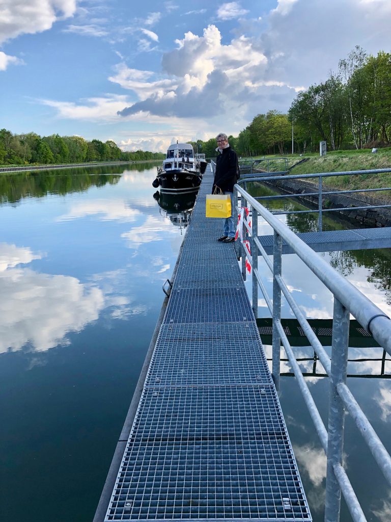 Im Hafen von Turnhout, gegen 18.15 Uhr, wird es eng mit unseren Einkäufen. Aber Aldi sei Dank (ist nur ein paar Schritte vom Hafen entfernt und schließt um 19.00 Uhr) kommen wir noch zum Lebensmittel bunkern für den Feiertag.