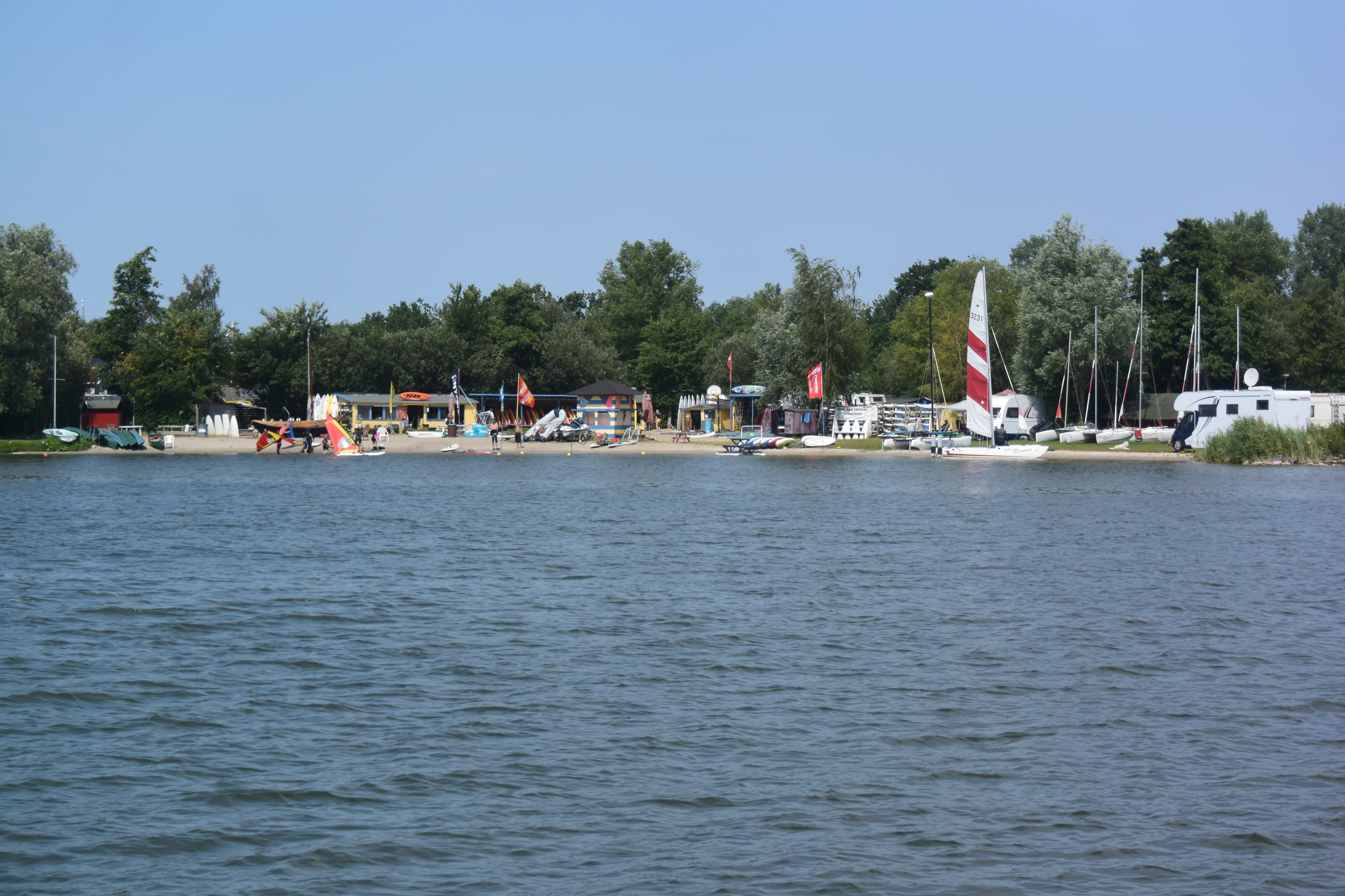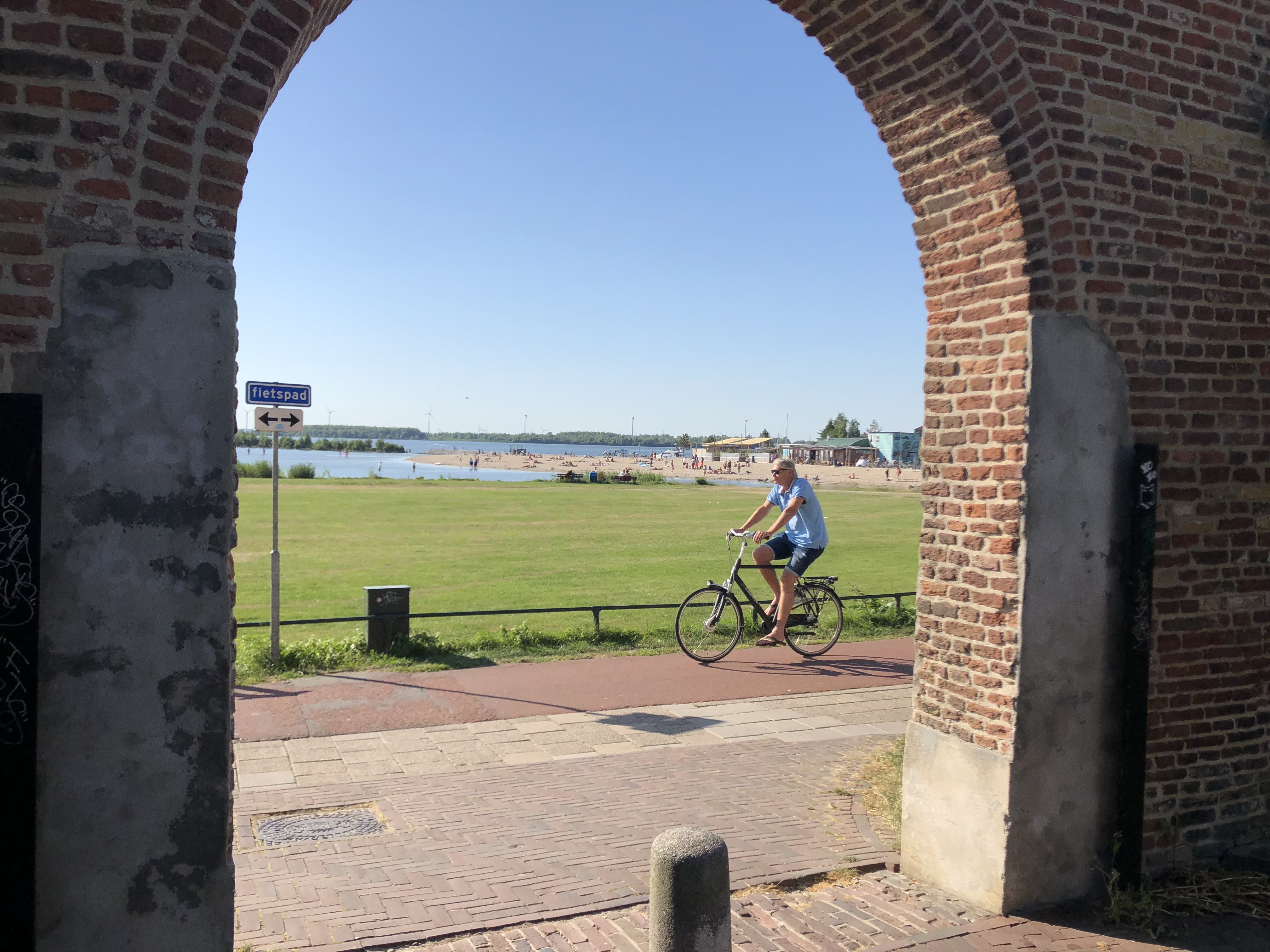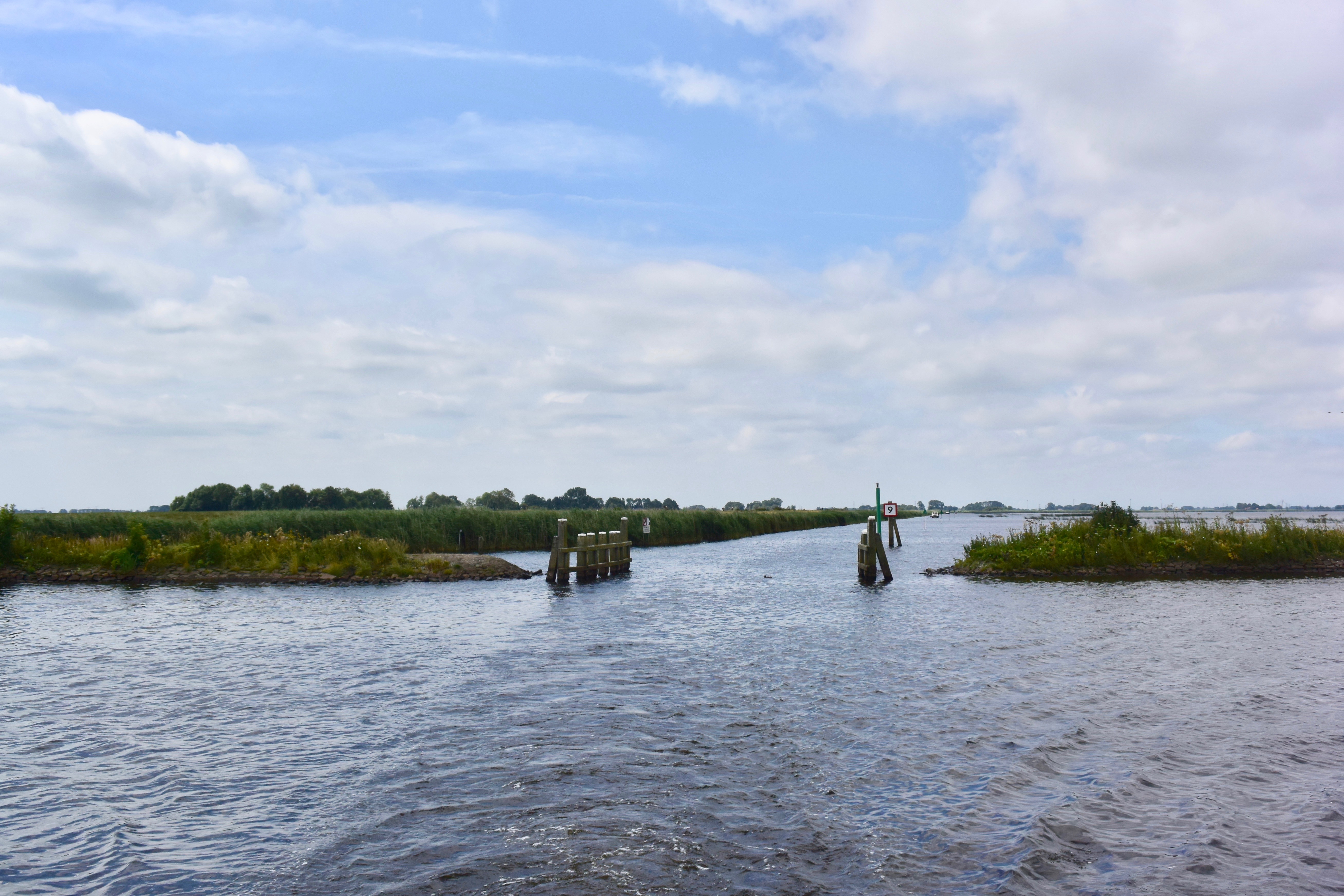 Ein „Fahrtag“. Zurück durch Muiden und über einige der „Randmere“ (Goimeer, Eemeer, Wolderwijd) bis Harderwijk. Sommer pur. Mit Wind, zur Freude der Segeler, Wind- und Kitesurfer. In Harderwijk nehmen wir diesmal den Außenanleger (nagelneu und per App organisiert).