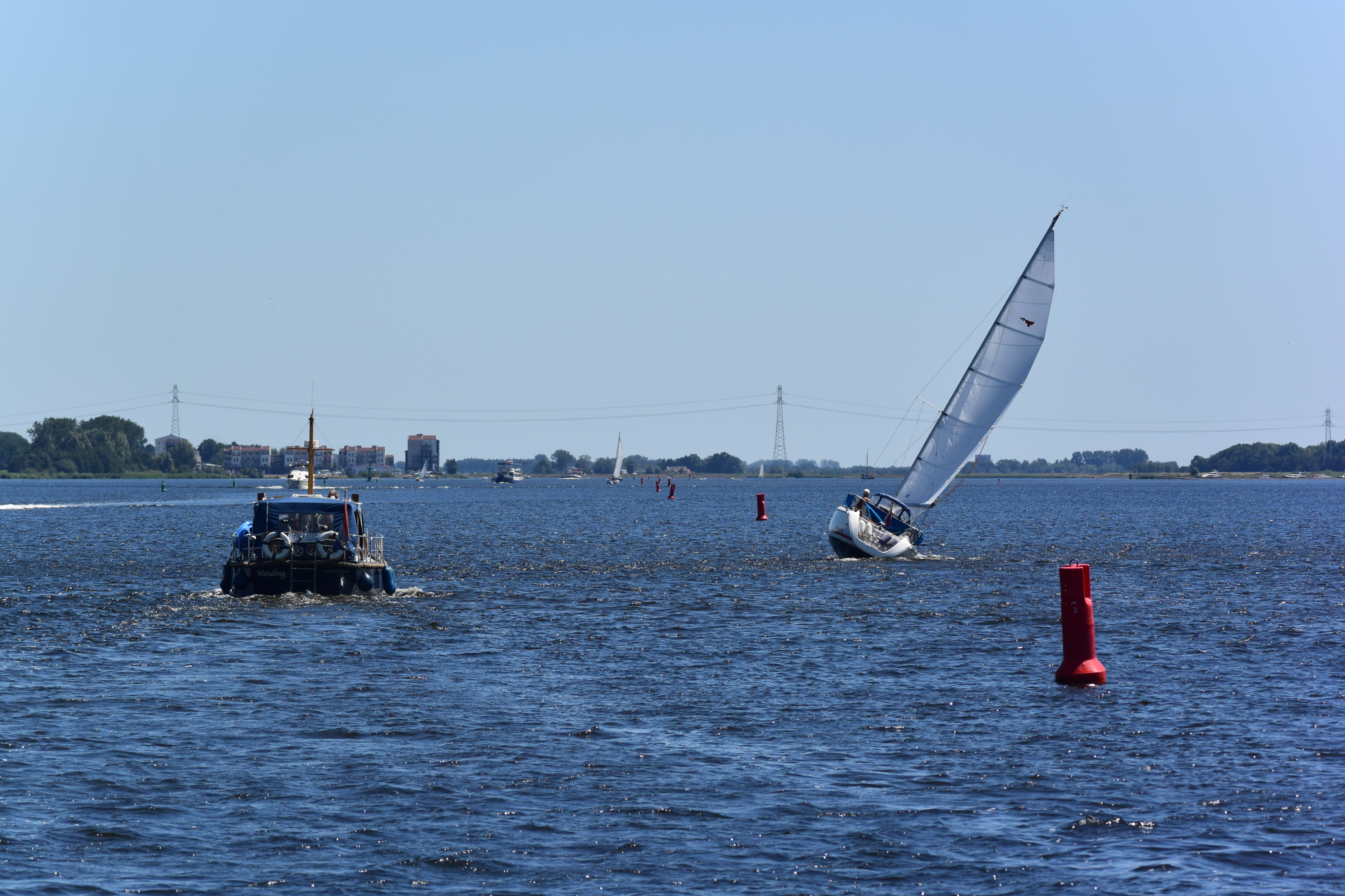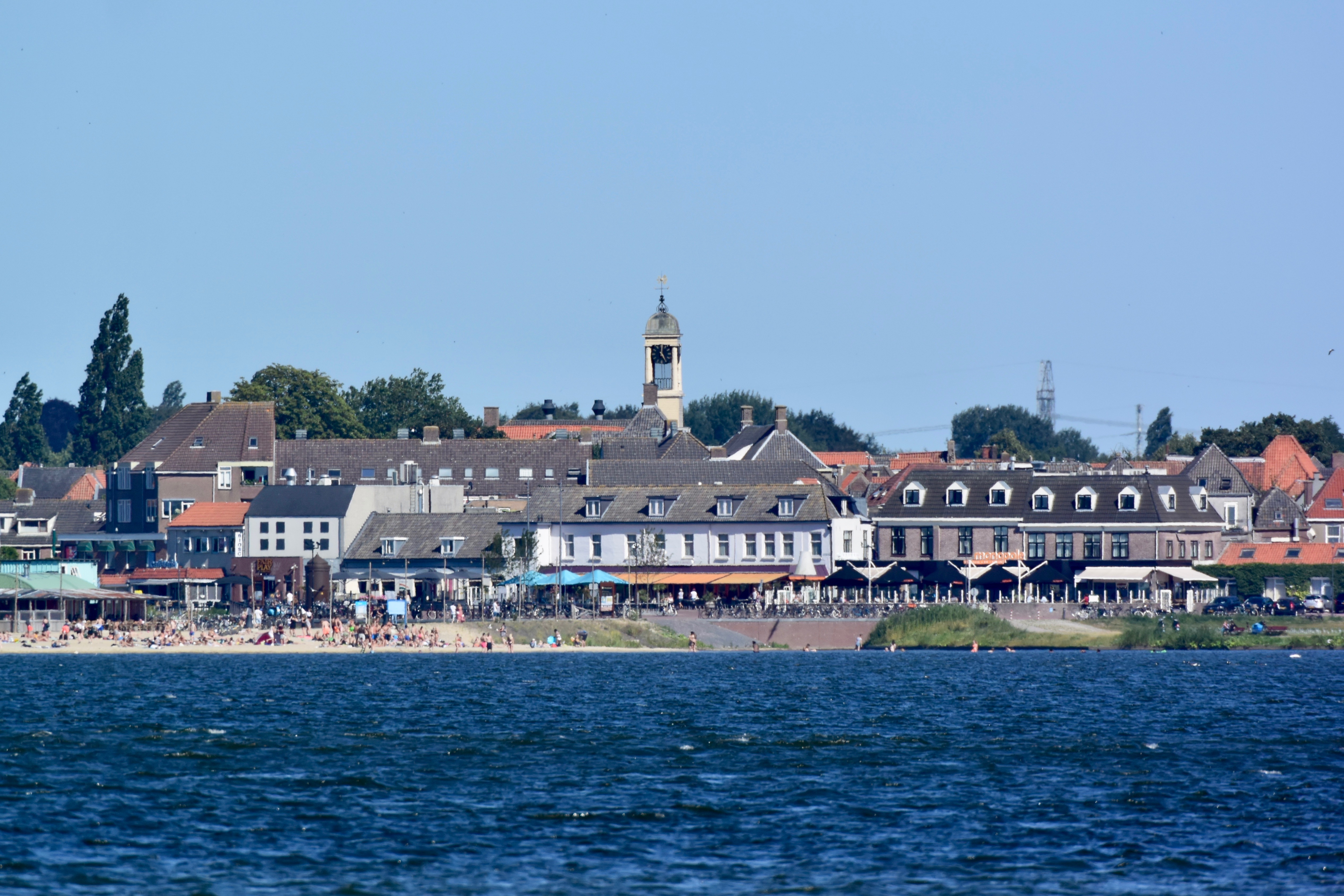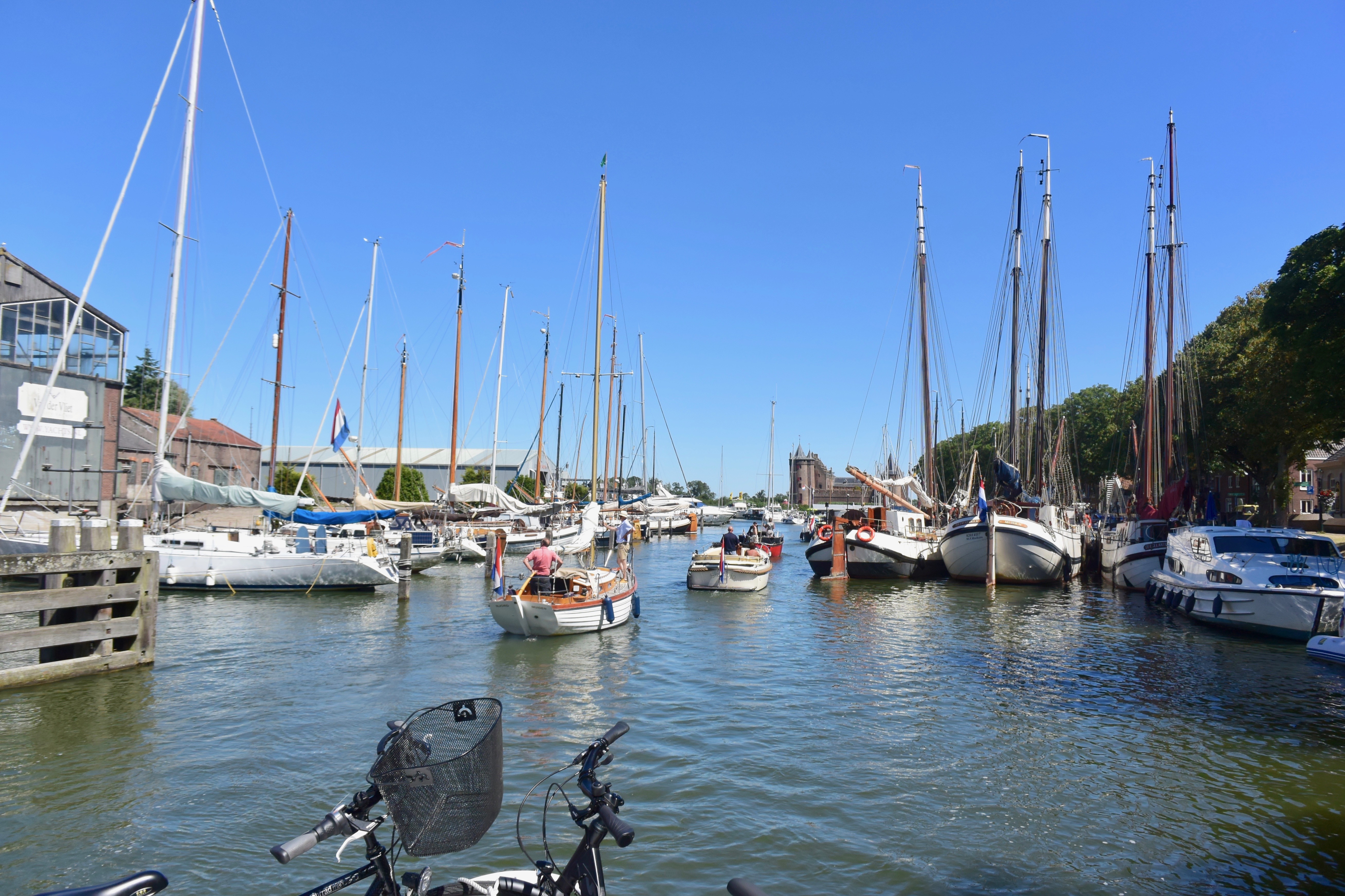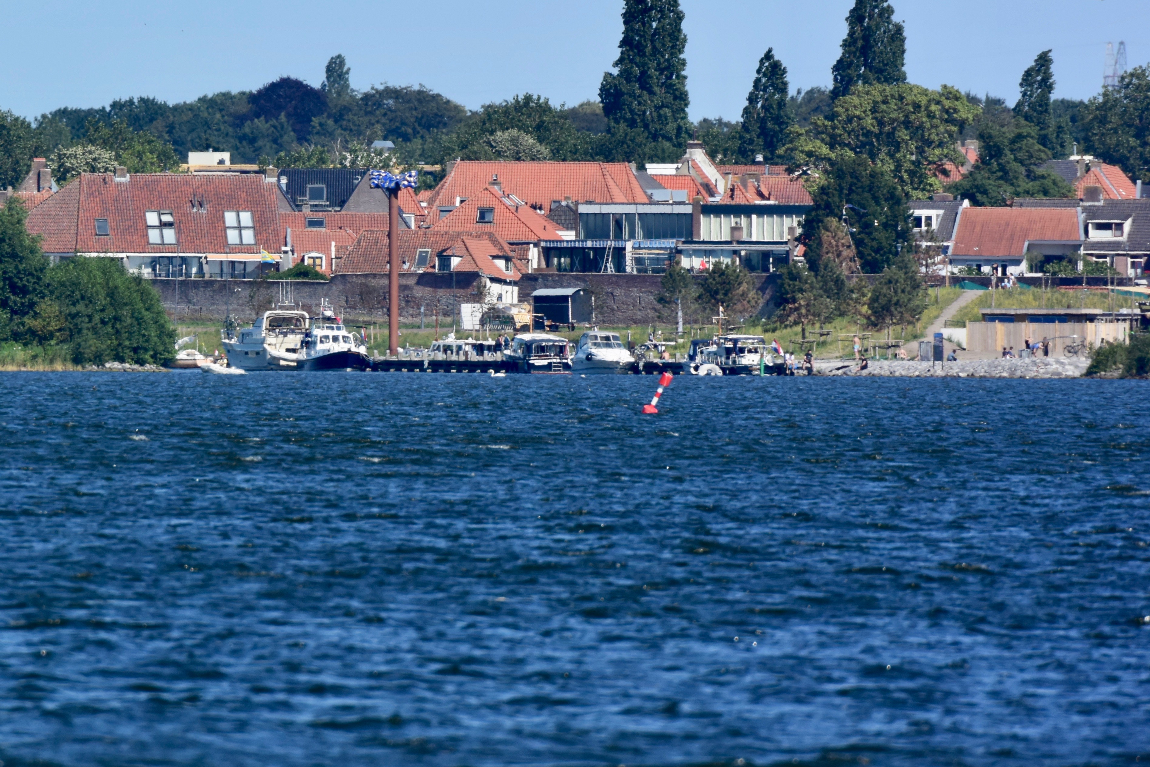 Ein „Fahrtag“. Zurück durch Muiden und über einige der „Randmere“ (Goimeer, Eemeer, Wolderwijd) bis Harderwijk. Sommer pur. Mit Wind, zur Freude der Segeler, Wind- und Kitesurfer. In Harderwijk nehmen wir diesmal den Außenanleger (nagelneu und per App organisiert).