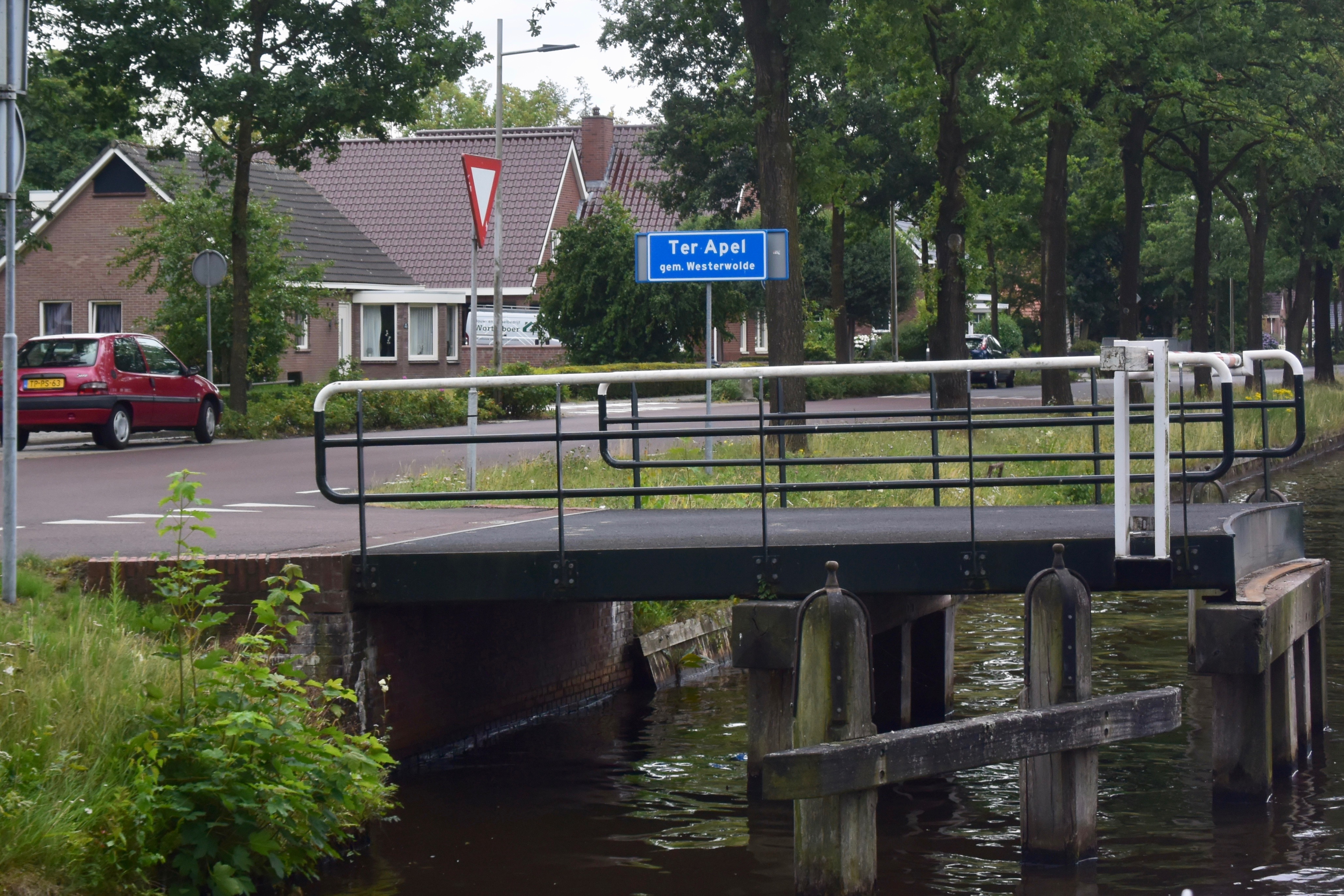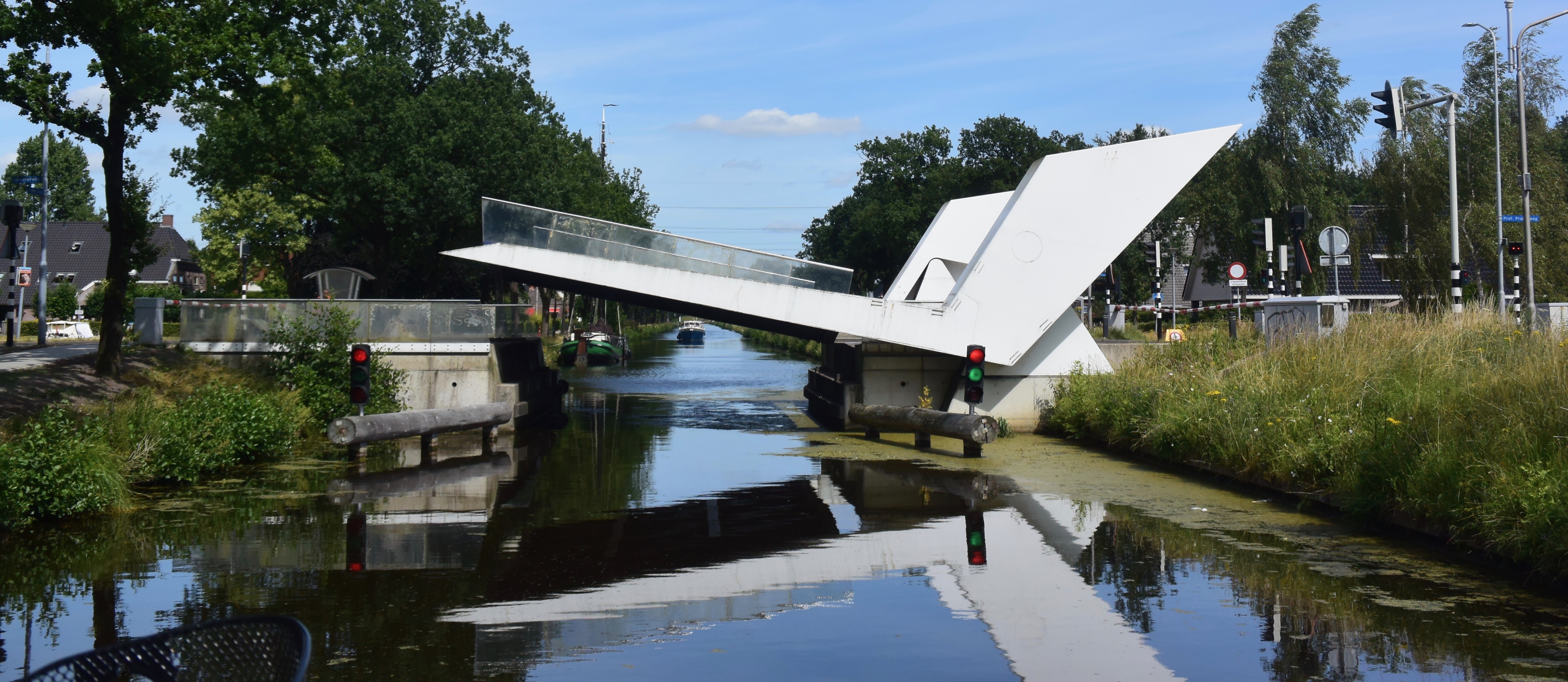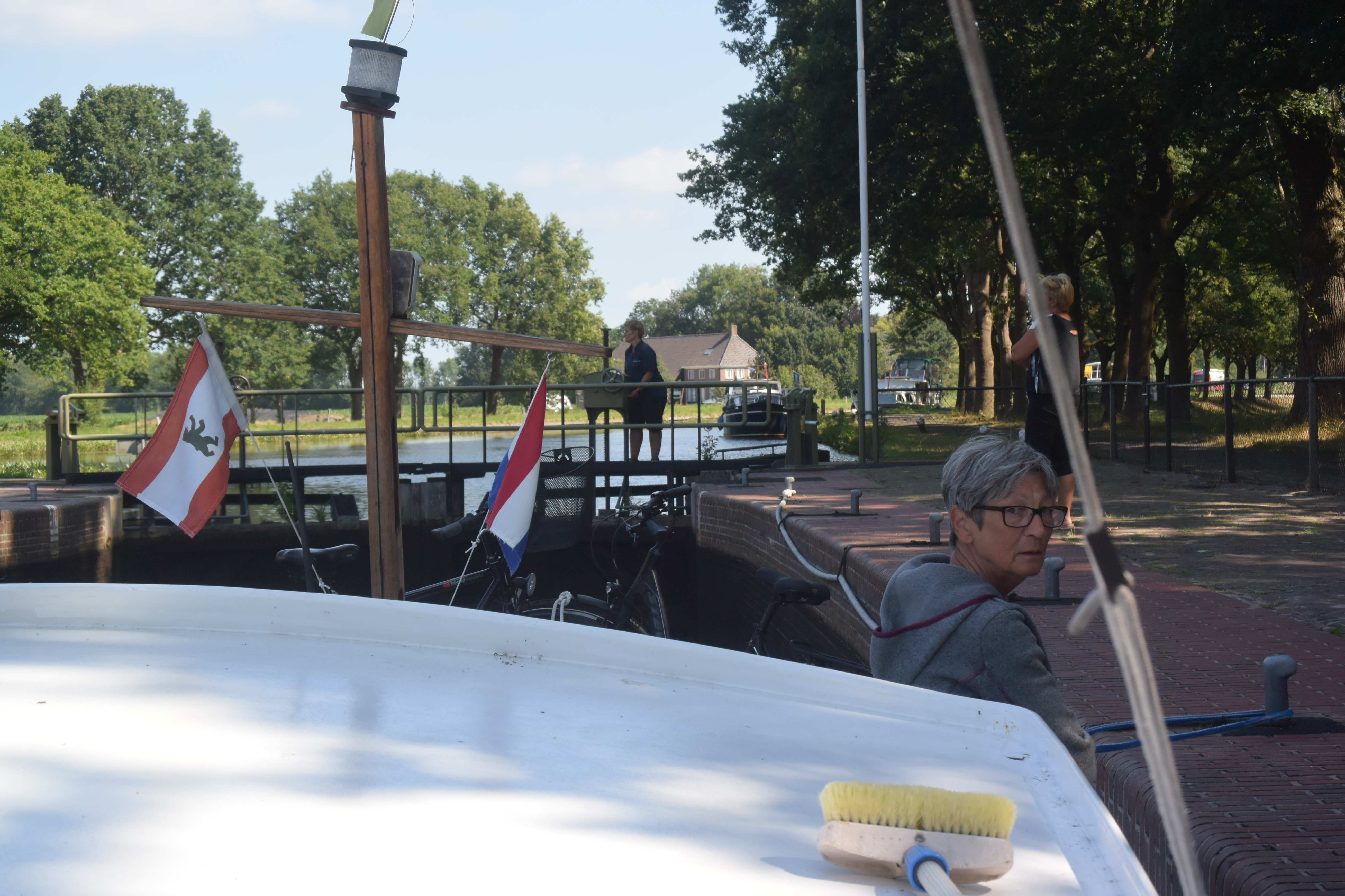 Entspanntes Fahren von Dieverbrug nach Assen. 24 km, 3 Schleusen, 3 Brücken direkt passierbar, 18 Brücken mit Bedienung. Schönes Sommerwetter, nicht zu heiß. Mittenmang die übliche Wärter-Mittagspause von 12-13 Uhr. Wieder führt uns die Strecke an Häusern und Höfen vorbei hinter denen gleich die Wiesen und Felder beginnen. Überall wochenendliches Schaffen. Eine Lieblingsbeschäftigung der Holländer: mit dem Laubsauger vor der Türe „kehren“. Der Staub wirbelt bis auf den Kanal.
