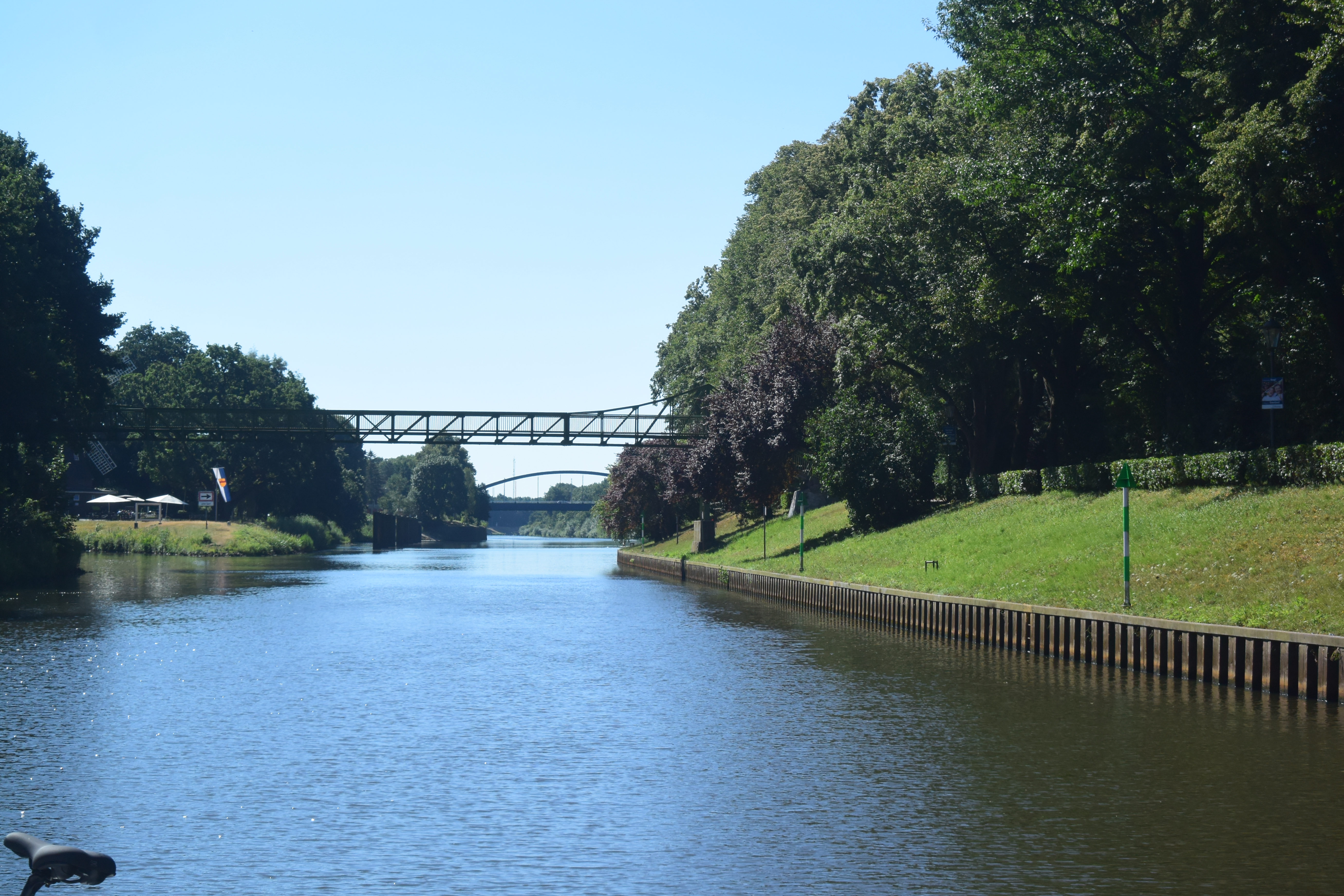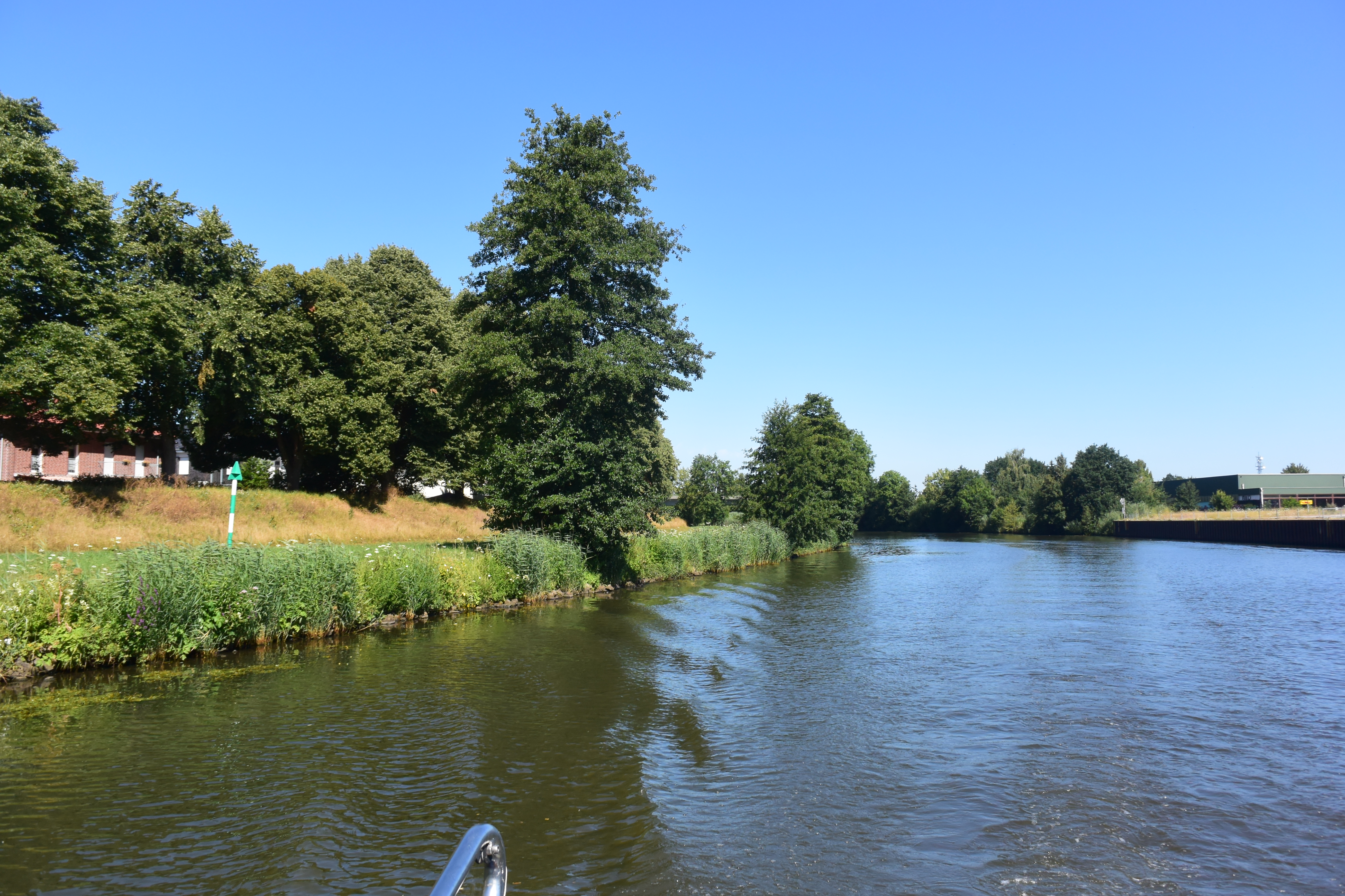 Nach dem „Rheine-Ausflugstag“ haben wir noch kurzfristig beschlossen, die letzten 10 km DEK mit zwei Schleusen als Vorabendprogramm 3 Stunden in spätnachmittaglicher, brennender Sonne zu genießen. Mit Einfahrt in den Mittellandkanal sind nun keine Schleusen mehr auf der Strecke bis Hannover. Wir machen Halt im ersten kleinen Seitenarm an einem Sportbootanleger.