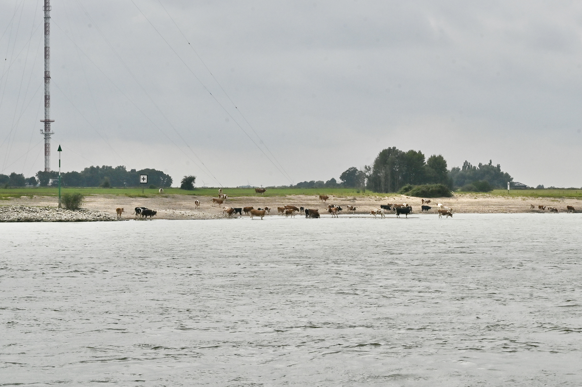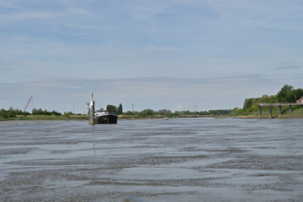 Der Mittwoch wird zu einer echten Strapaze. Kurz nach Lier kommt die Gezeitenschleuse Duffel. Ab hier fließt die Nete, die in die Rupel mündet, die wiederum in die Schelde mündet. Nete und Rupel sind Gezeitenflüsse. Also gegen 11.30 Uhr mit fallendem Wasser zur Schelde. Kleine Panne im Mündungsbogen der Nete in die Rupel: wir fahren zu weit backbord und landen auf einer kleinen Sandbank. Zum Glück können wir uns selbst wieder freifahren.
