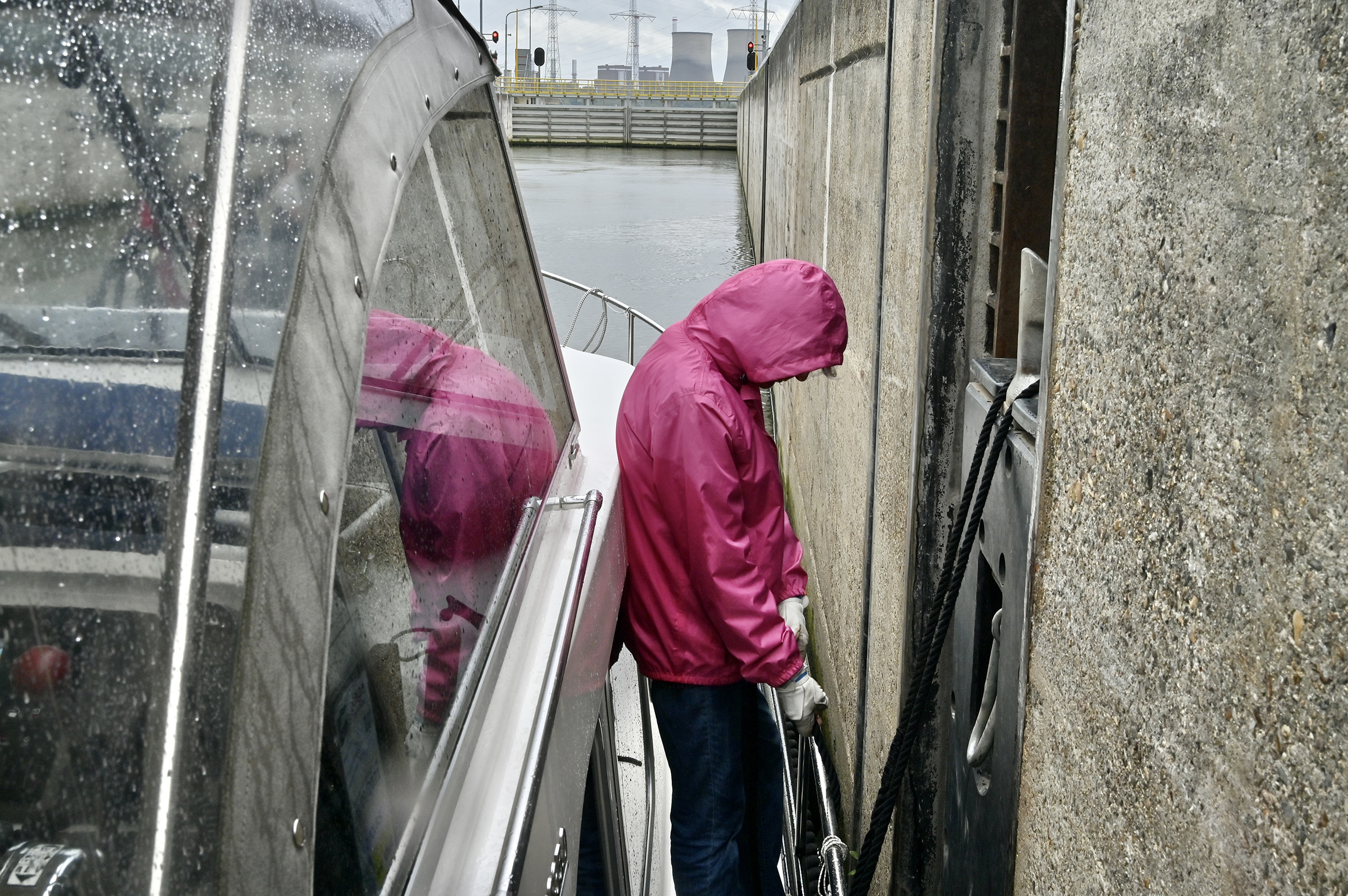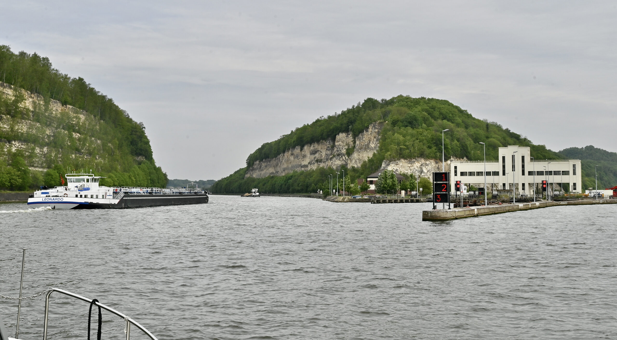 Die sechs Schleusen sind alle gleich ausgestattet. Je eine große sowie zwei kleinere Kammern. Das Schleusen geht einigermaßen reibungslos. Wir schwimmen mit den Frachtern fast im Gleichtakt. Nur ein Problem, wo am Tagesende anlegen? Zwei Yachthäfen befinden sich strategisch ungünstig mehr am Anfang und am Ende des Kanals. Sportbootanleger im Mittelbereich sucht man vergeblich. Unser erster Etappentag am Dienstag, 10.05., endet mit Einbruch der Dunkelheit direkt hinter der Schleuse Olen. Hier reihen wir uns in die zahlreichen Frachtschiffe an den Anlegern im großen Schleusenvorhof ein und fallen hundemüde in die Kojen. Für die ungefähr 87 km samt sechs Schleusen stehen volle 12 Stunden auf dem Zettel.