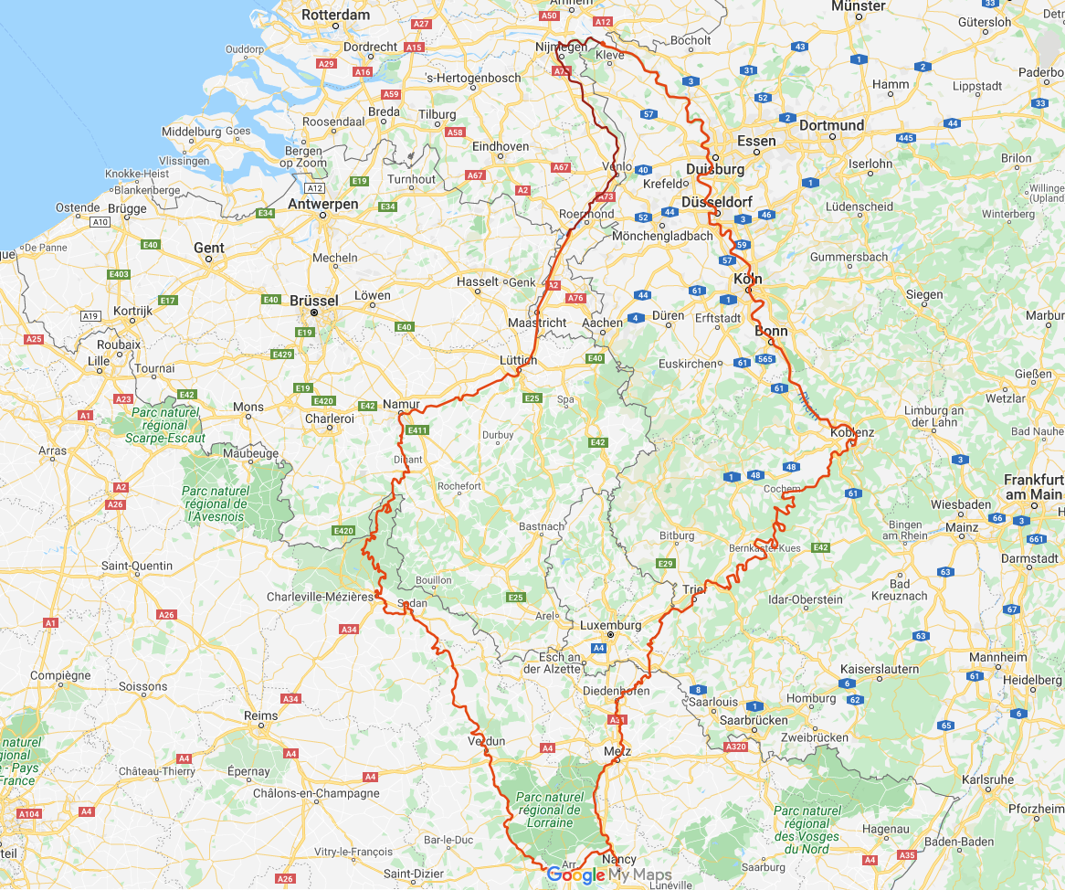 Das Herzstück der Tour in diesem Jahr: Die Maas in der Wallonie (Liège, Huy, Namur, Dinant) und in Frankreich (u. a. Revin, Charleville-Mésières, Sedan, Stenay, Verdun, Commercy, Toul) sowie Nancy und Metz. La Meuse, eine geschichtsträchtige (und sehr leidvolle) Region. Mit vielen interessanten Eindrücken, einer fantastischen Landschaft, liebenswerten, freundlichen Menschen und jede Menge Spaß.