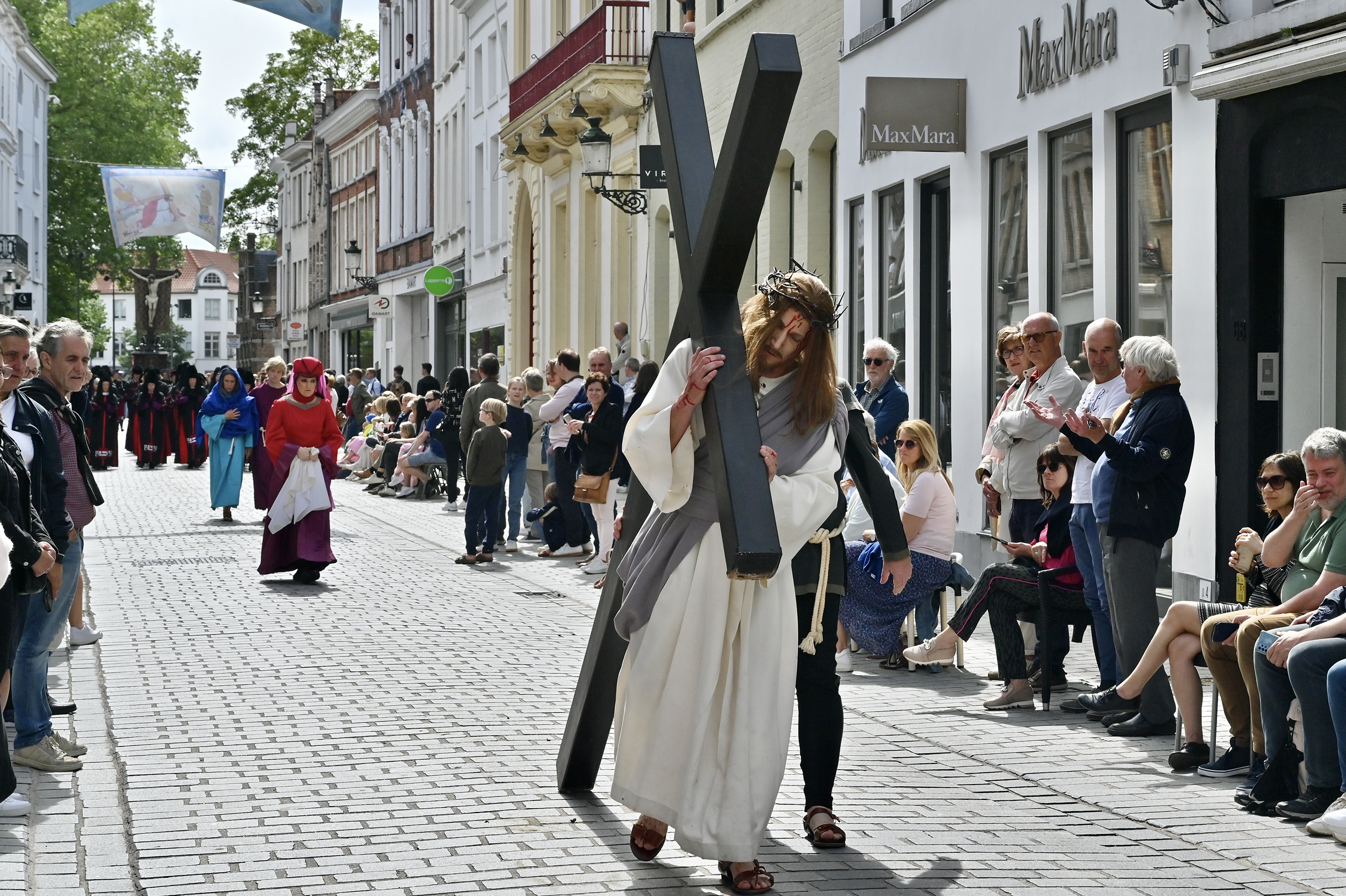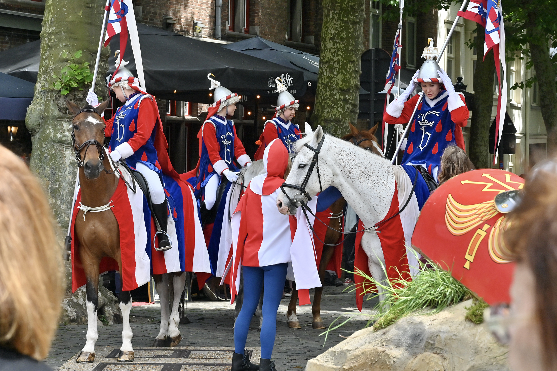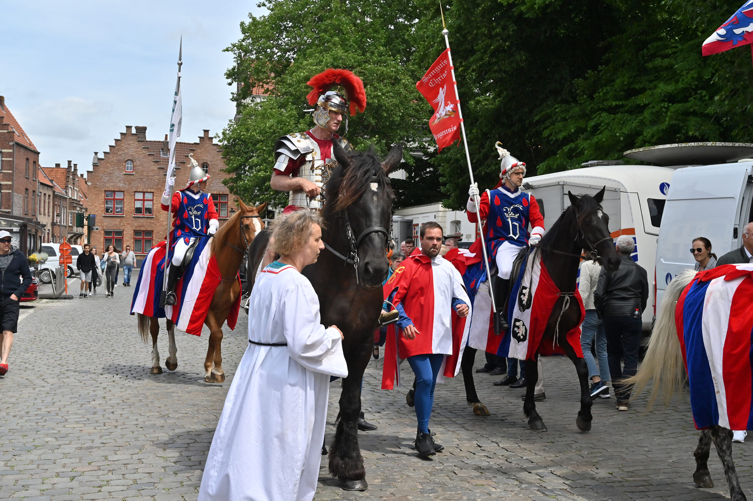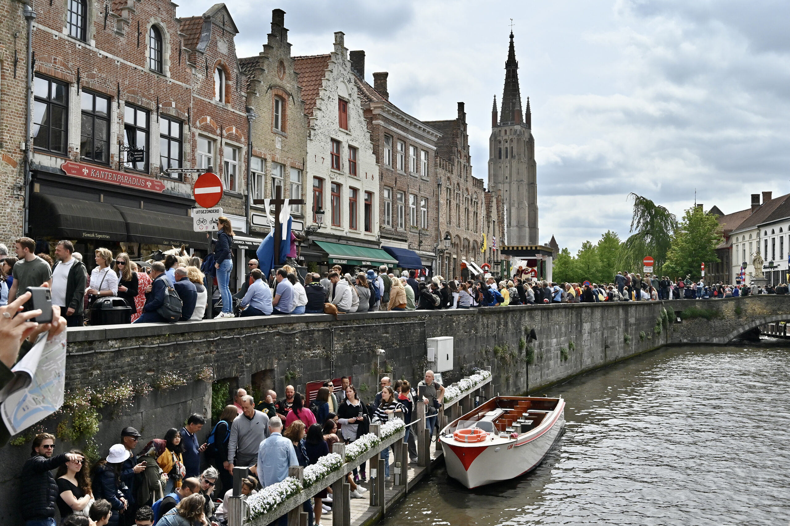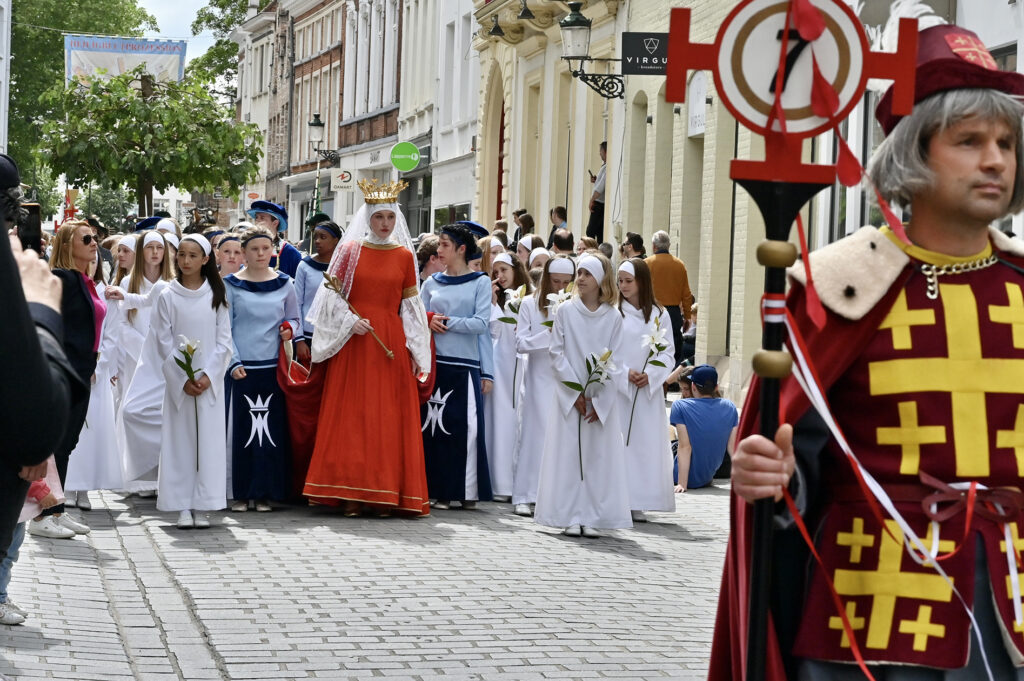 Himmelfahrt, Heilig Bloed Processie in Brügge. Die Stadt ist übervoll mit Besuchern, wir merken es sogar bei unserem Anleger, wie verzweifelt Autoparkplätze gesucht werden. Die Prozession ist in vier Teile unterteilt, Altes Testament, Neues Testament, Eintreffen der Reliquie des Heiligen Blutes und Präsentation derselben. Über 1700 Teilnehmer singen, musizieren, tanzen und treten auf.