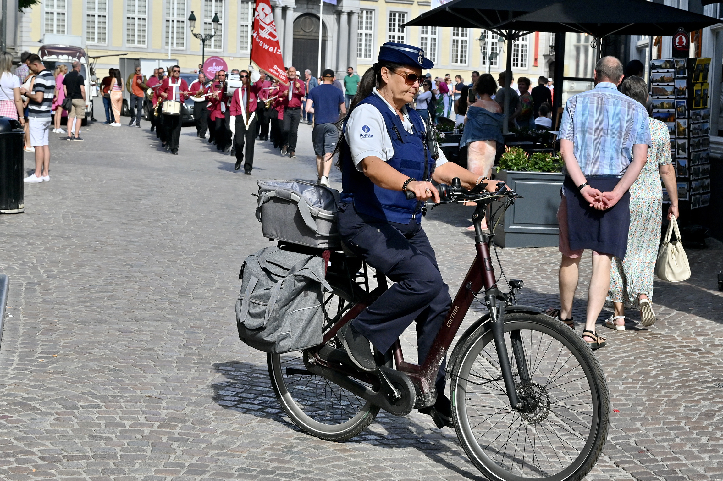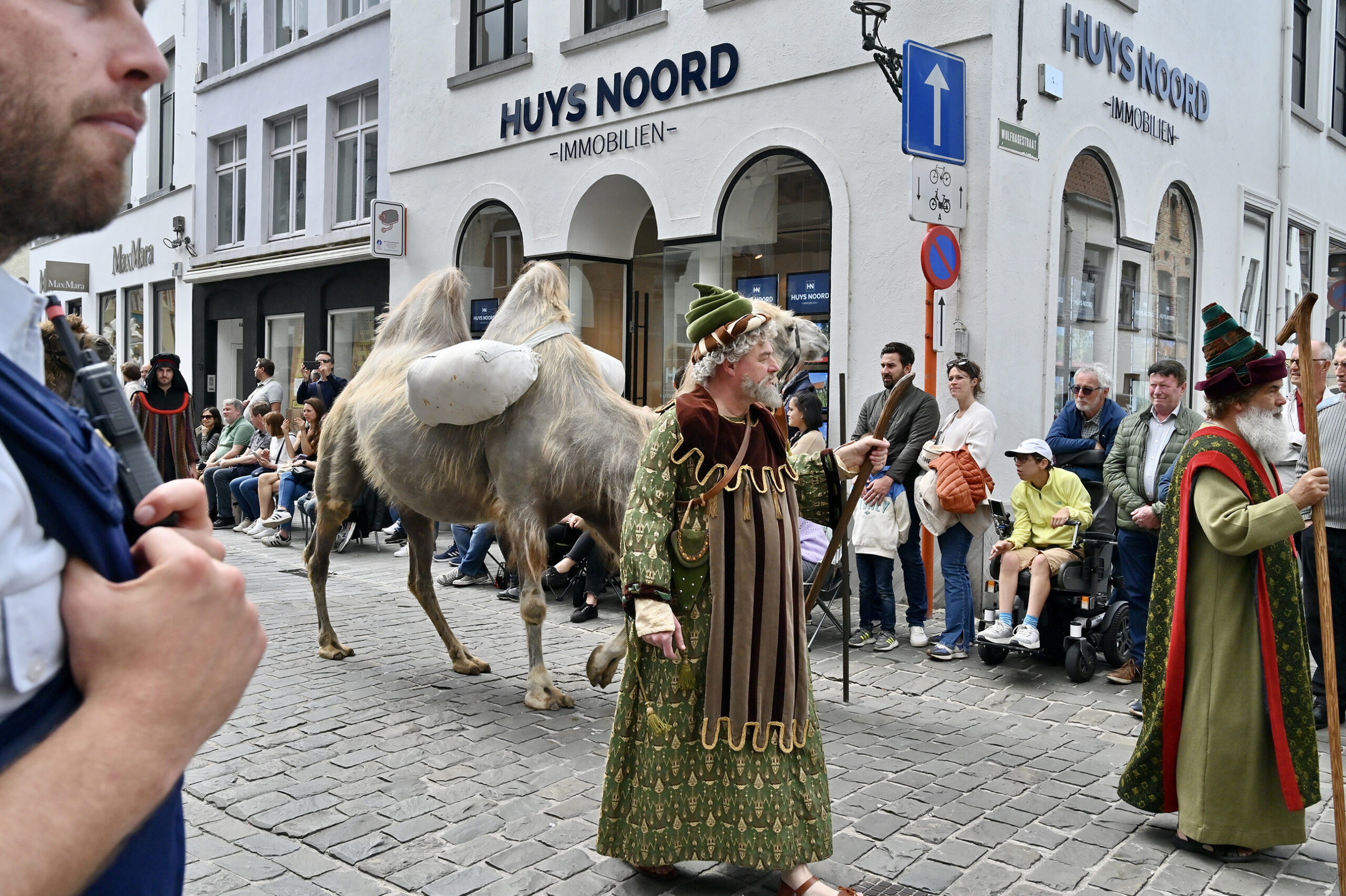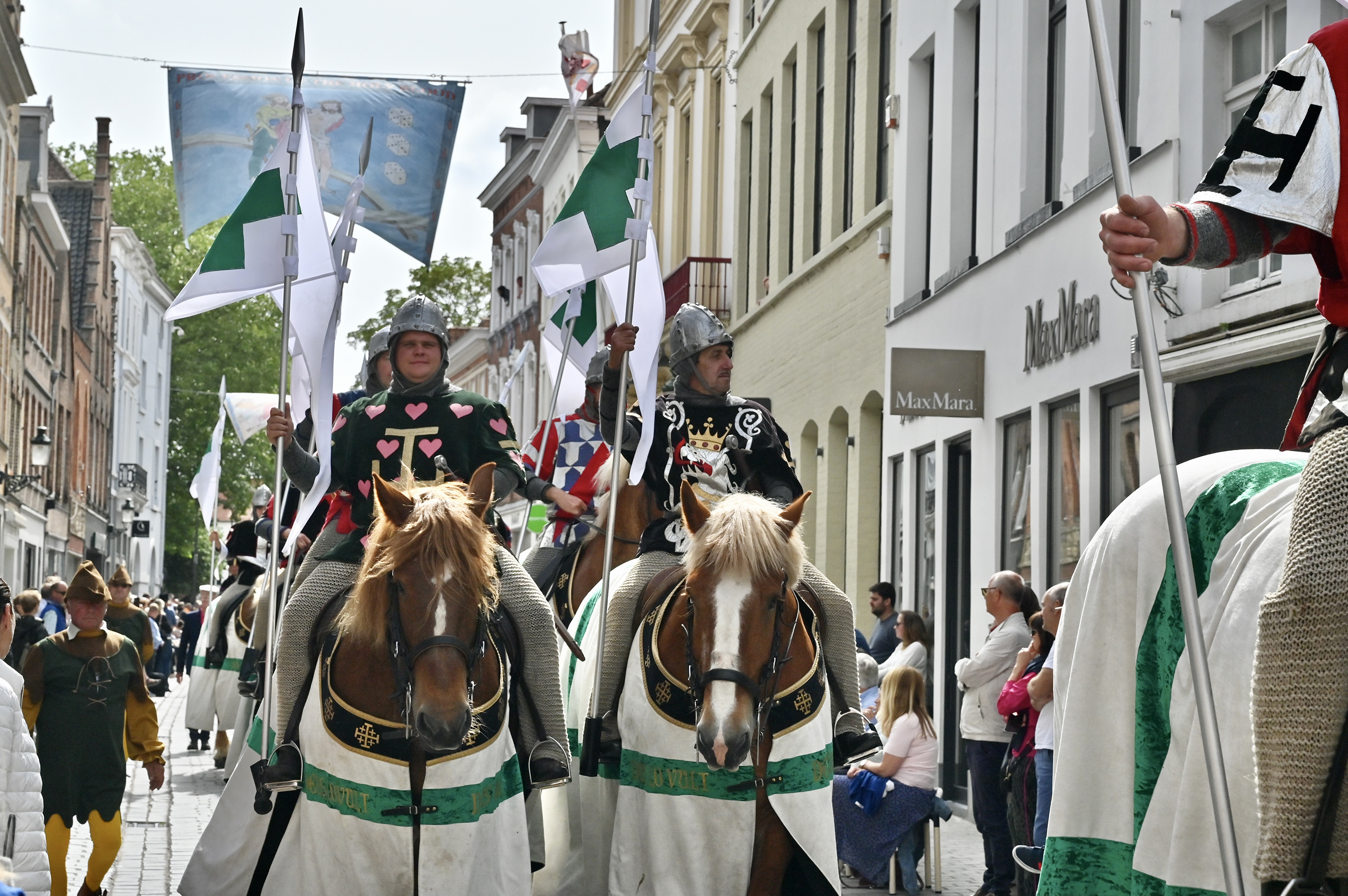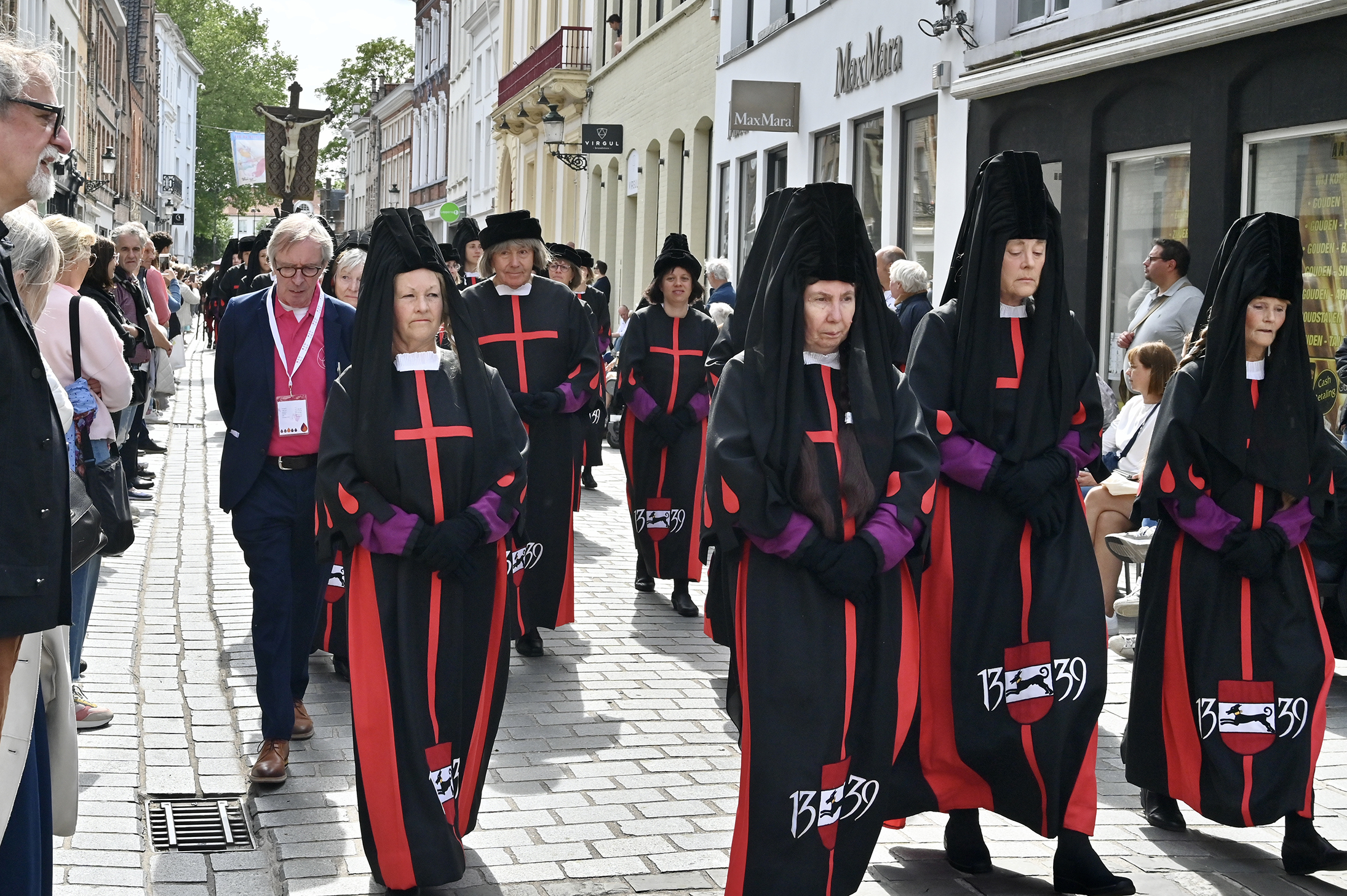 Himmelfahrt, Heilig Bloed Processie in Brügge. Die Stadt ist übervoll mit Besuchern, wir merken es sogar bei unserem Anleger, wie verzweifelt Autoparkplätze gesucht werden. Die Prozession ist in vier Teile unterteilt, Altes Testament, Neues Testament, Eintreffen der Reliquie des Heiligen Blutes und Präsentation derselben. Über 1700 Teilnehmer singen, musizieren, tanzen und treten auf.