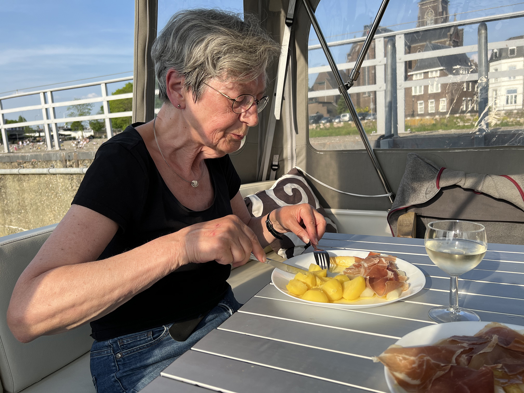 Am Di., 03.05., starten wir vollbepackt (samt Räder) per PKW nach Maasbracht. 7 1/2 Stunden brauchen wir für die 640 km. Zurück an Bord stehen etliche Routinearbeiten an. Navionics-Kartenabo verlängern. Updates für diverse Geräte und Anwendungen downloaden und installieren. Prüfen, ob alle bestellten Winterarbeiten ausgeführt wurden. Alles bestens – fast. Das Reinigen der Persenning ist wohl in der kältesten Jahreszeit erfolgt. D. h., während der Reinigung stand die Plicht längere Zeit ungeschützt im Freien. Dementsprechend sieht das Teakdeck und das Holz-Steuerrad jetzt aus. Sehr ärgerlich und nur mit viel Aufwand wieder fit zu machen.