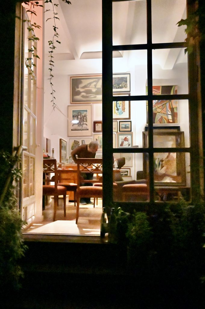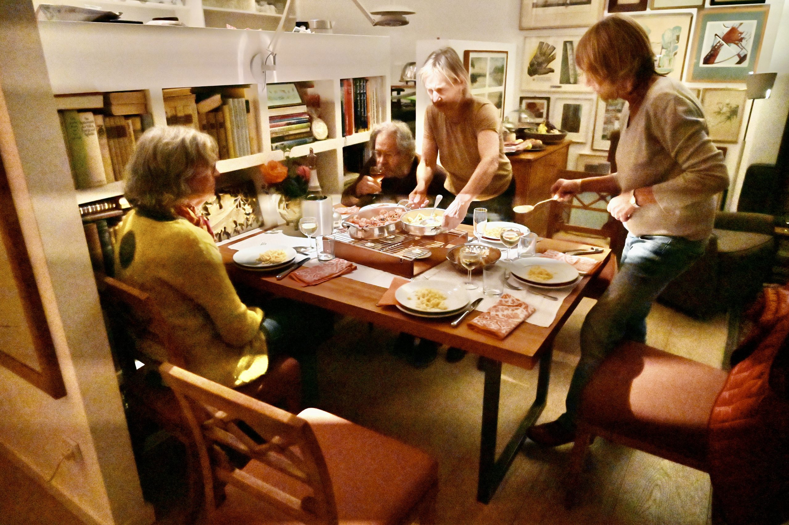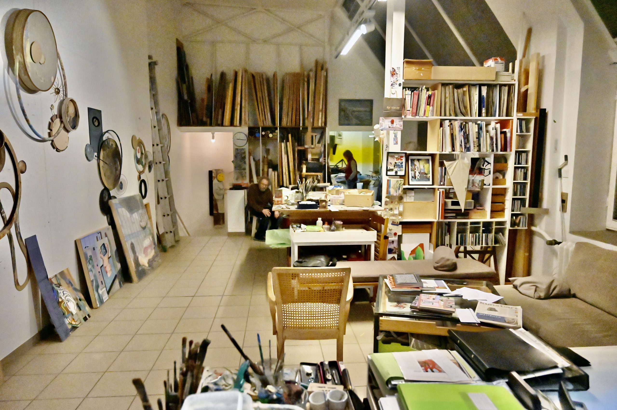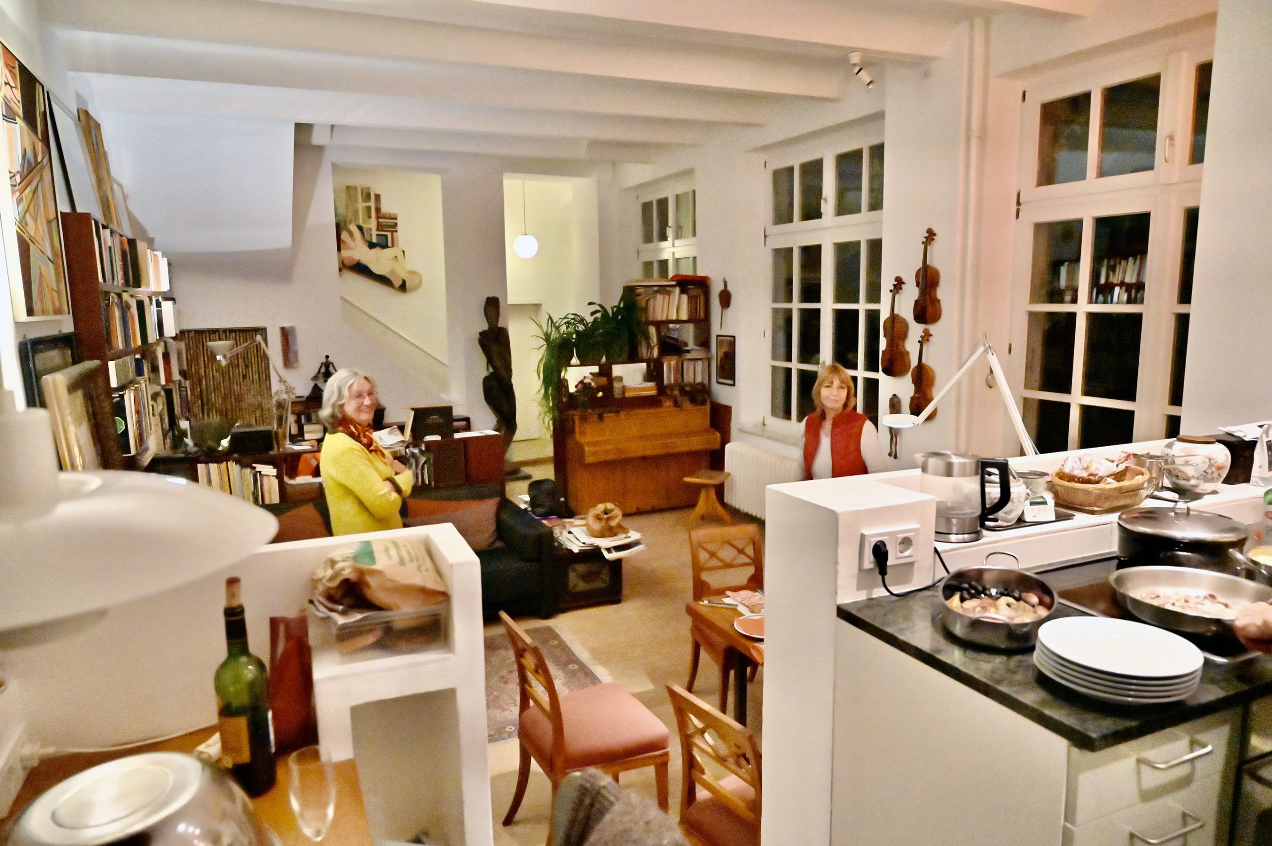 Der Abend gehört Elvira und Misch. Einer Einladung zum Abendessen als Dankeschön für ihre Aufenthaltsmöglichkeit bei uns in Rixdorf folgen wir mit Petra zusammen (Hanno hatte leider keine Zeit) sehr gern. Das Atelierhaus in Unterbilk fasziniert uns. Eine einmalige Atmosphäre im Erdgeschoß und ein riesiges, lichtdurchflutetes Atelier darüber. Elvira zaubert ein opulentes, hervorragendes 4-Gänge-Menü auf den Tisch. Misch führt uns in einer Pause durchs Atelier. Ein sehr schöner, unterhaltsamer Abend, der erst spät endet.
