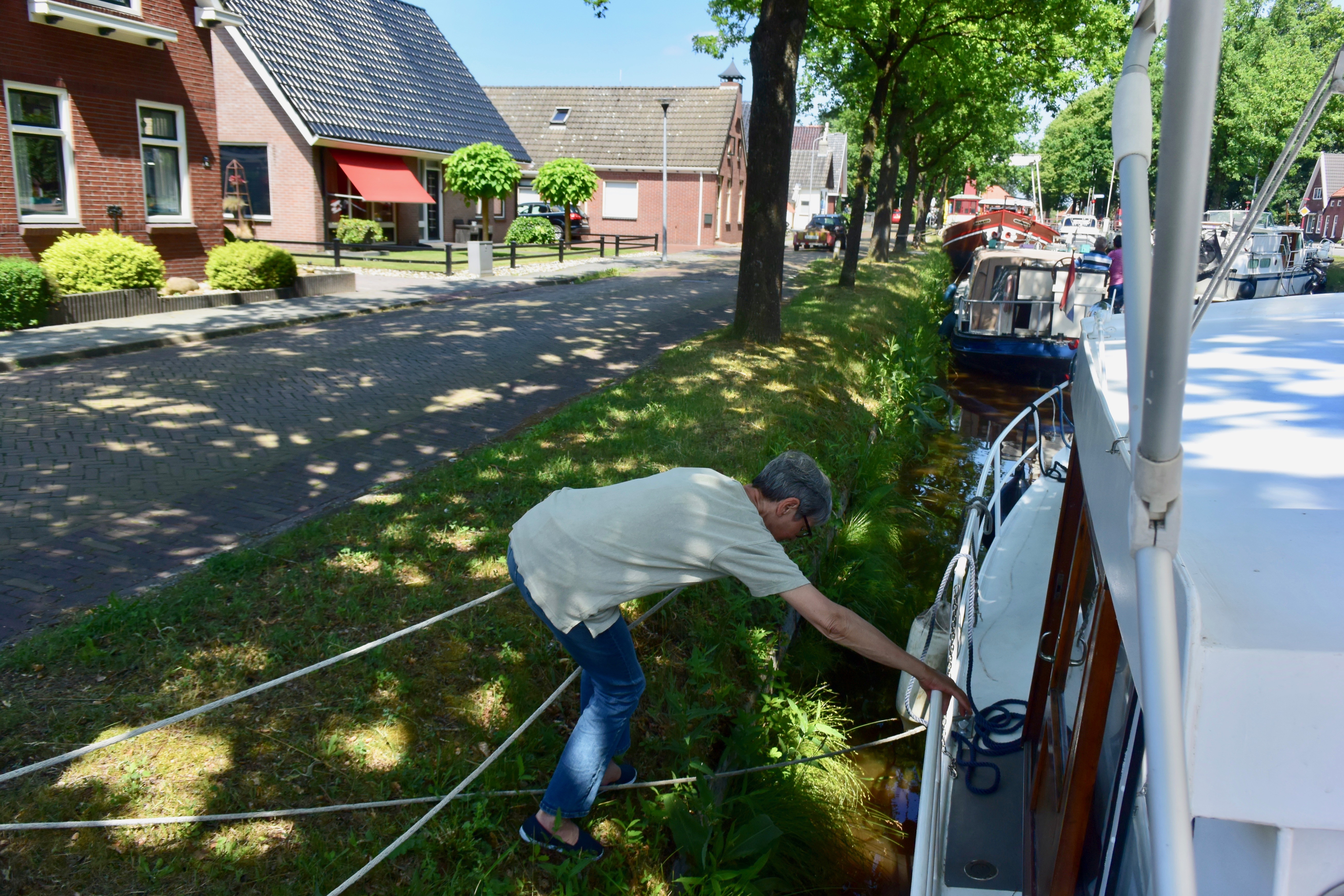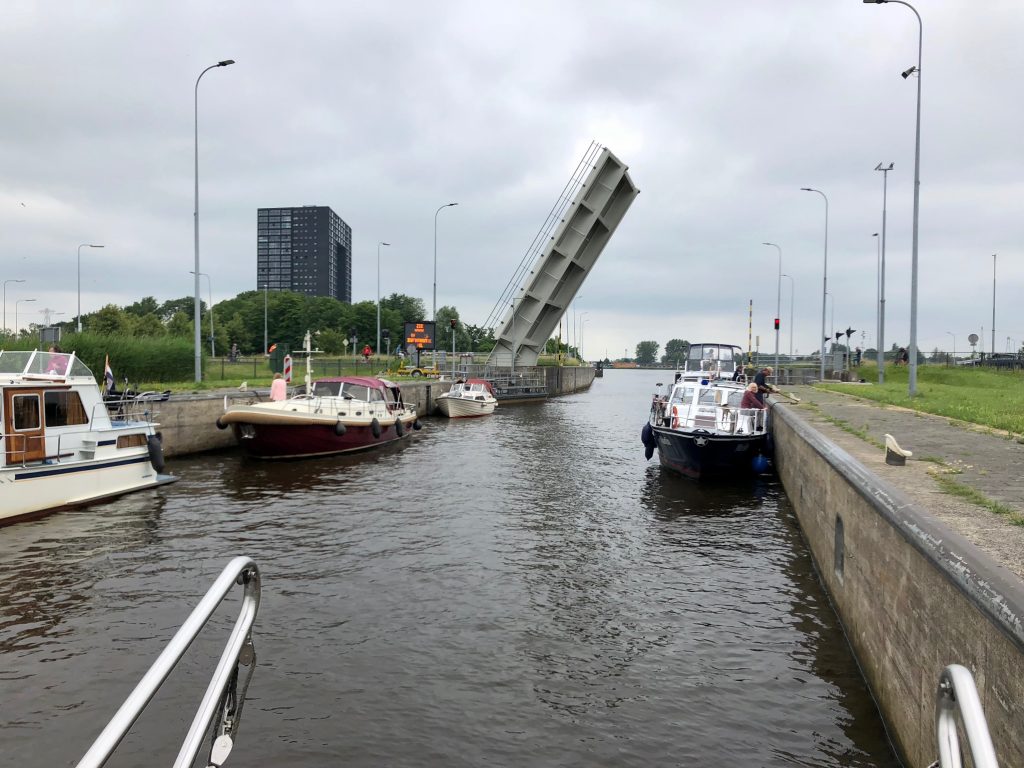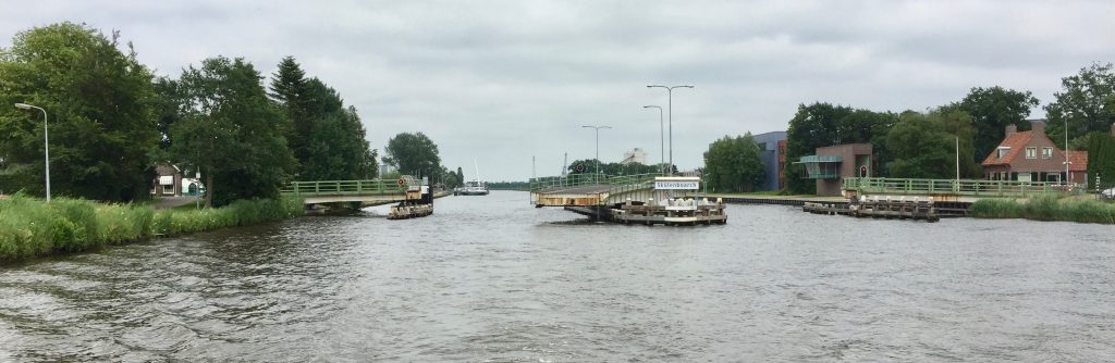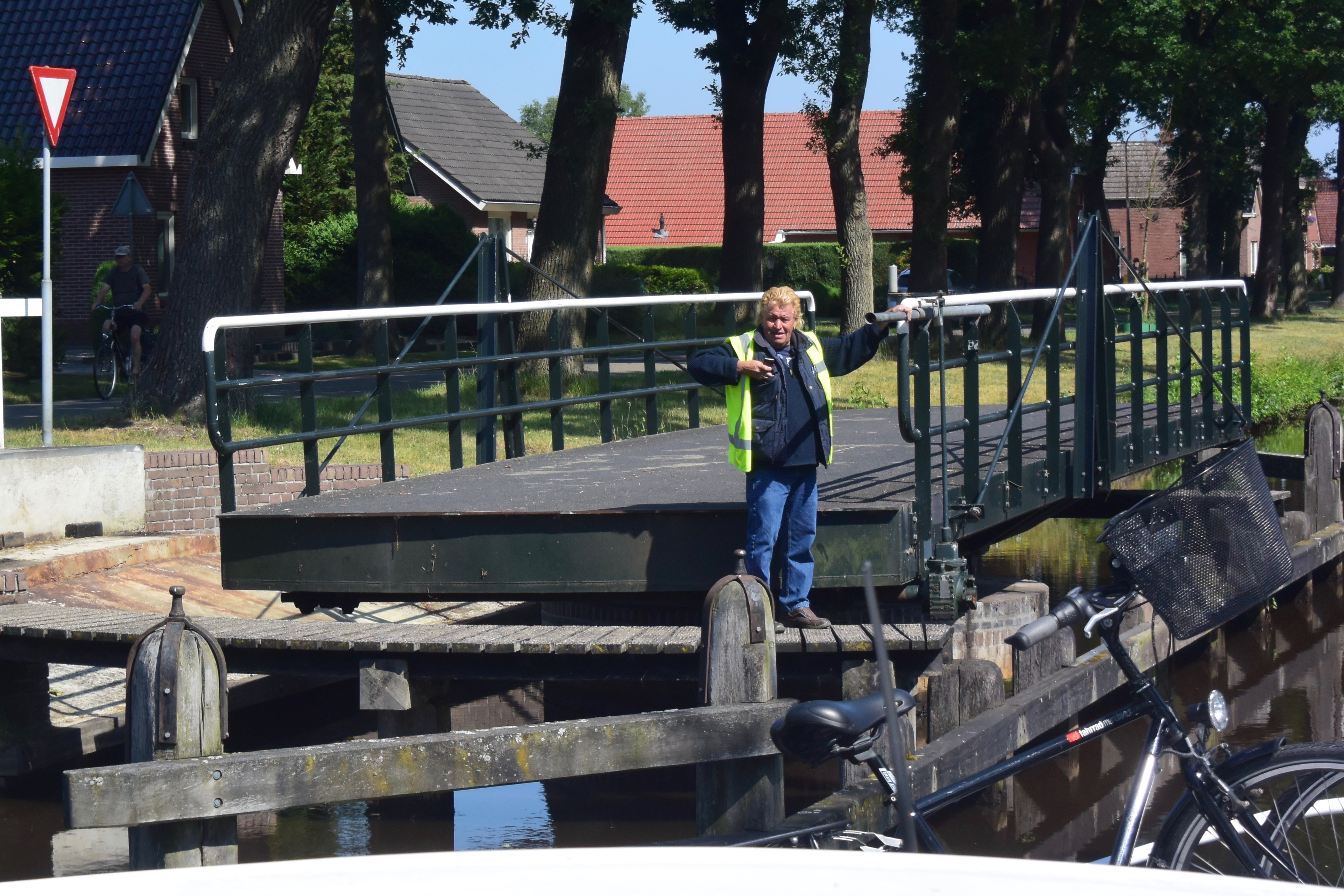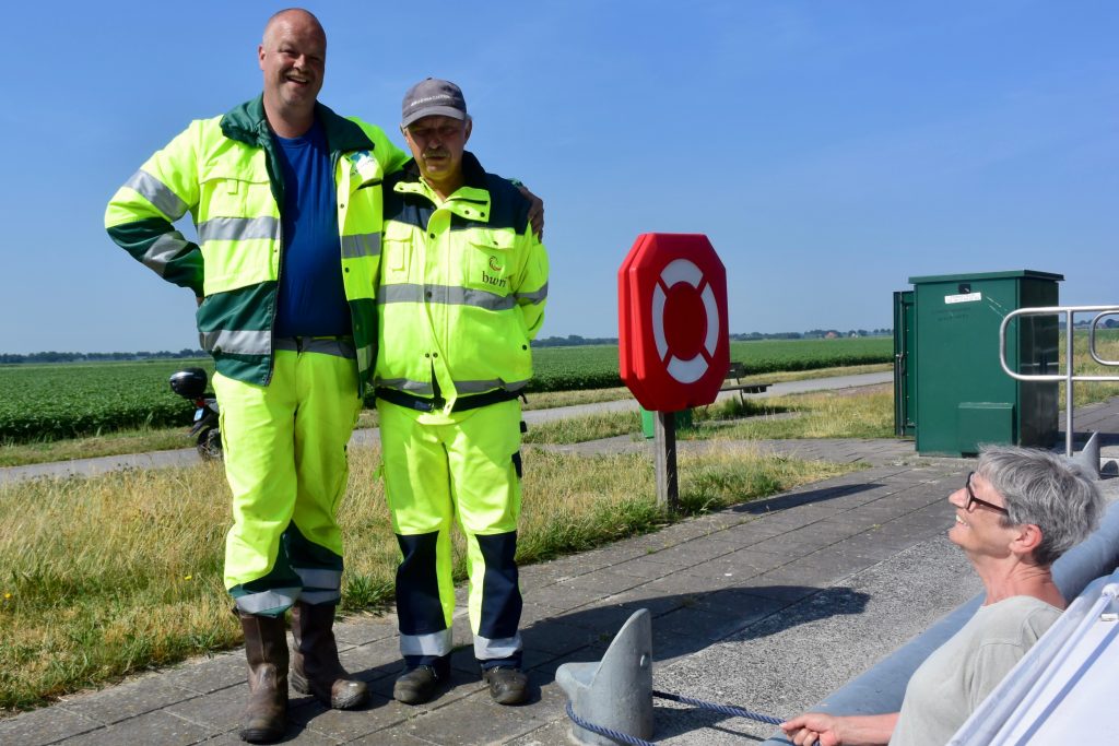 Uns teilen sich zwei der drei Schleusenwärter zu und ab geht die Lucy! Drei Stunden sind die beiden jetzt unsere Begleiter. Das war uns fast schon unangenehm, derart aufwändig (und kostenfrei) umsorgt zu werden; 26 Brücken, gut gemixt zwischen manuellen und elektrischen Brücken und 2 kleinen Schleusen. An den Schleusen ist ein kleiner Schnack möglich, aber aufgrund der jeweils nicht vorhandenen Sprachkenntnisse doch recht übersichtlich. Während der erste Schleusenwärter in Aktion ist, fährt der andere schon mal eine Brücke weiter und öffnet sie für unsere nahezu stoppfreie Durchfahrt. Aber, wie schon gesagt, bei 6 km/h, bleibt es eine absolut entschleunigte Reise. Wir passieren beidseitig recht dichte Reihen mit direkt am Kanal stehenden Häusern. Ab und zu von einer kleinen Kirche unterbrochen. Hinter den Häusern sind Wiesen und Felder. Sonst nichts. Am Ende der Tour entlassen uns unsere beiden Begleiter mit einem Übersichtblatt vom Zuidlaardermeer (betonnte Fahrrinnen, da sehr flach) und guten Wünschen.