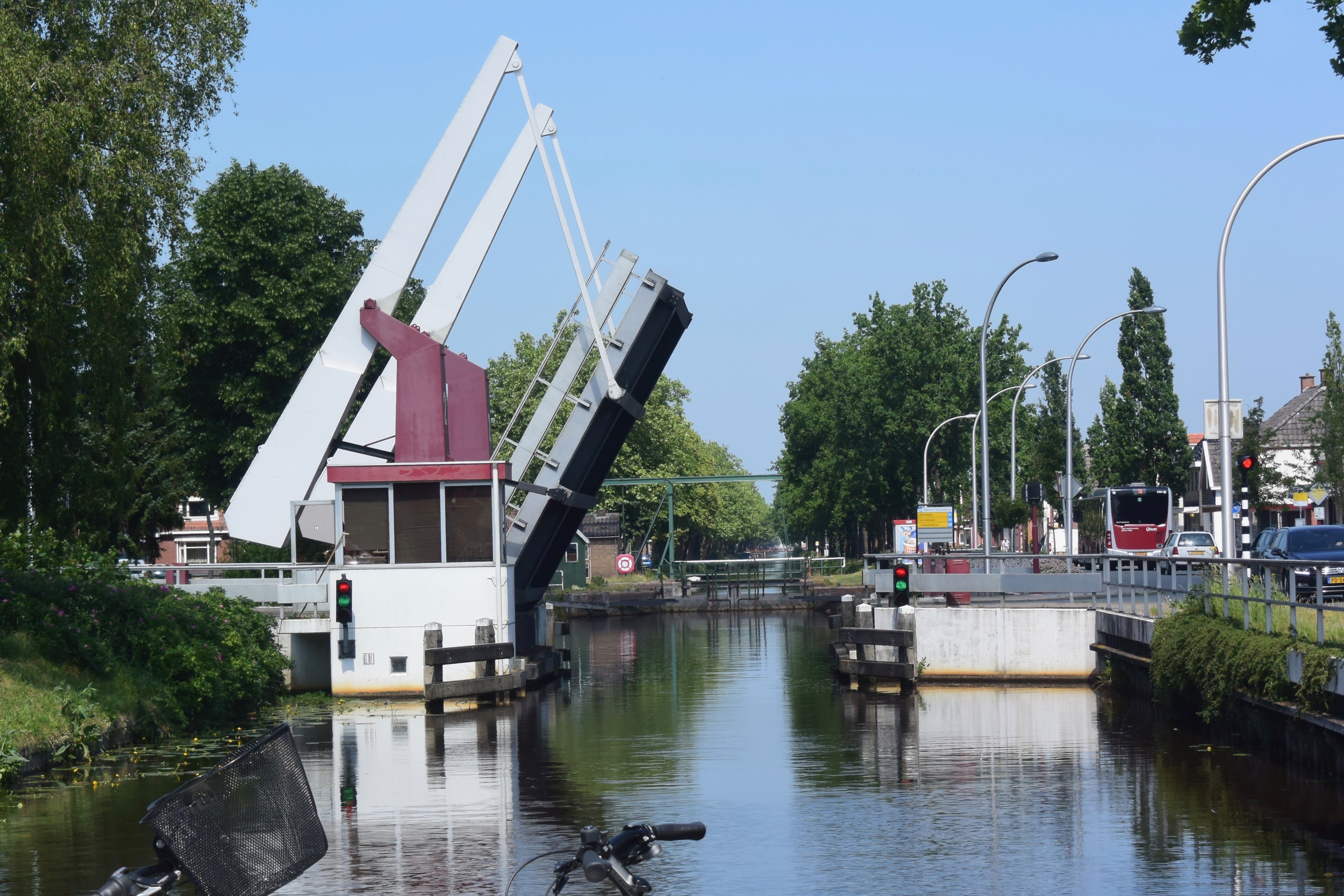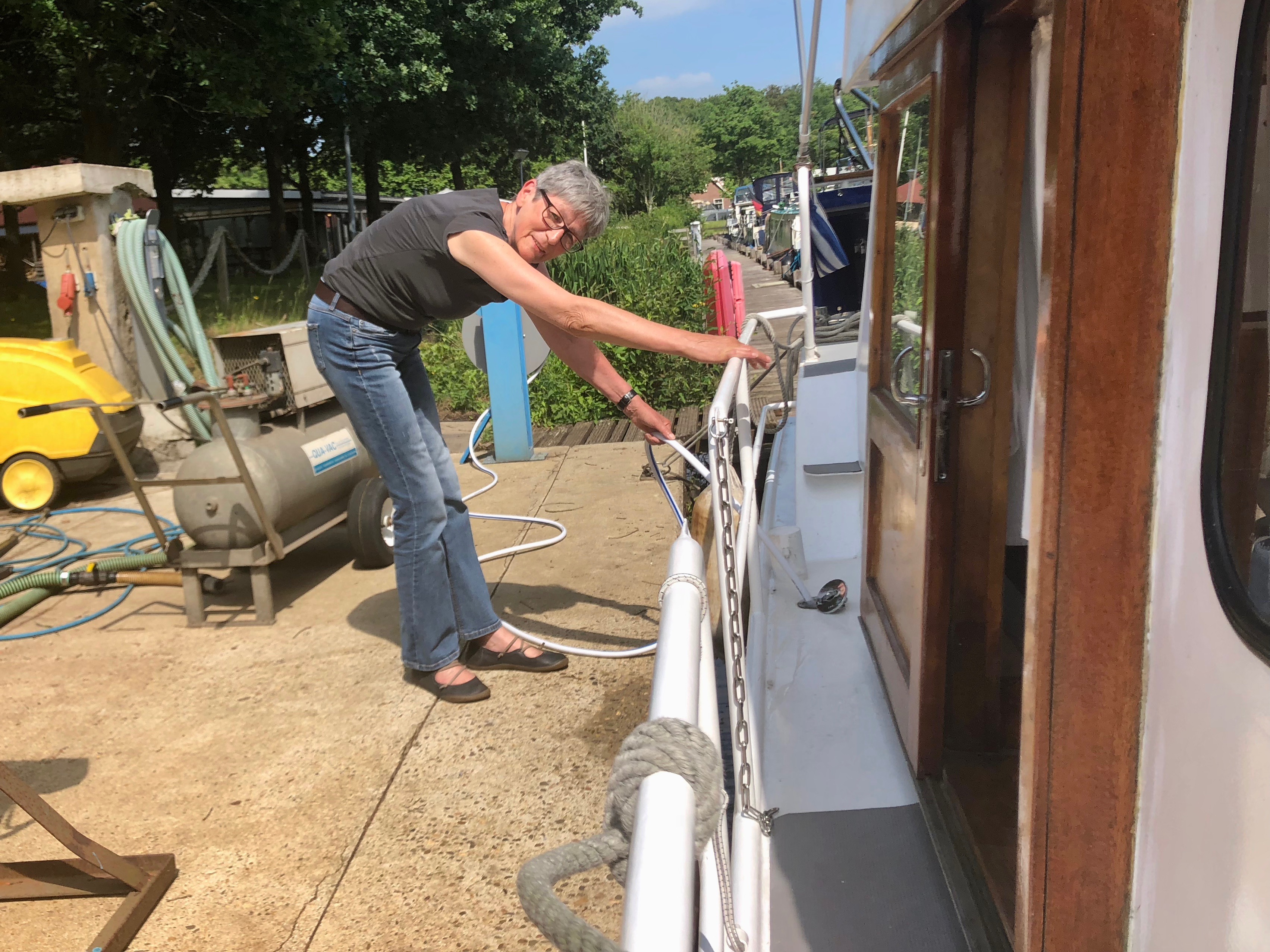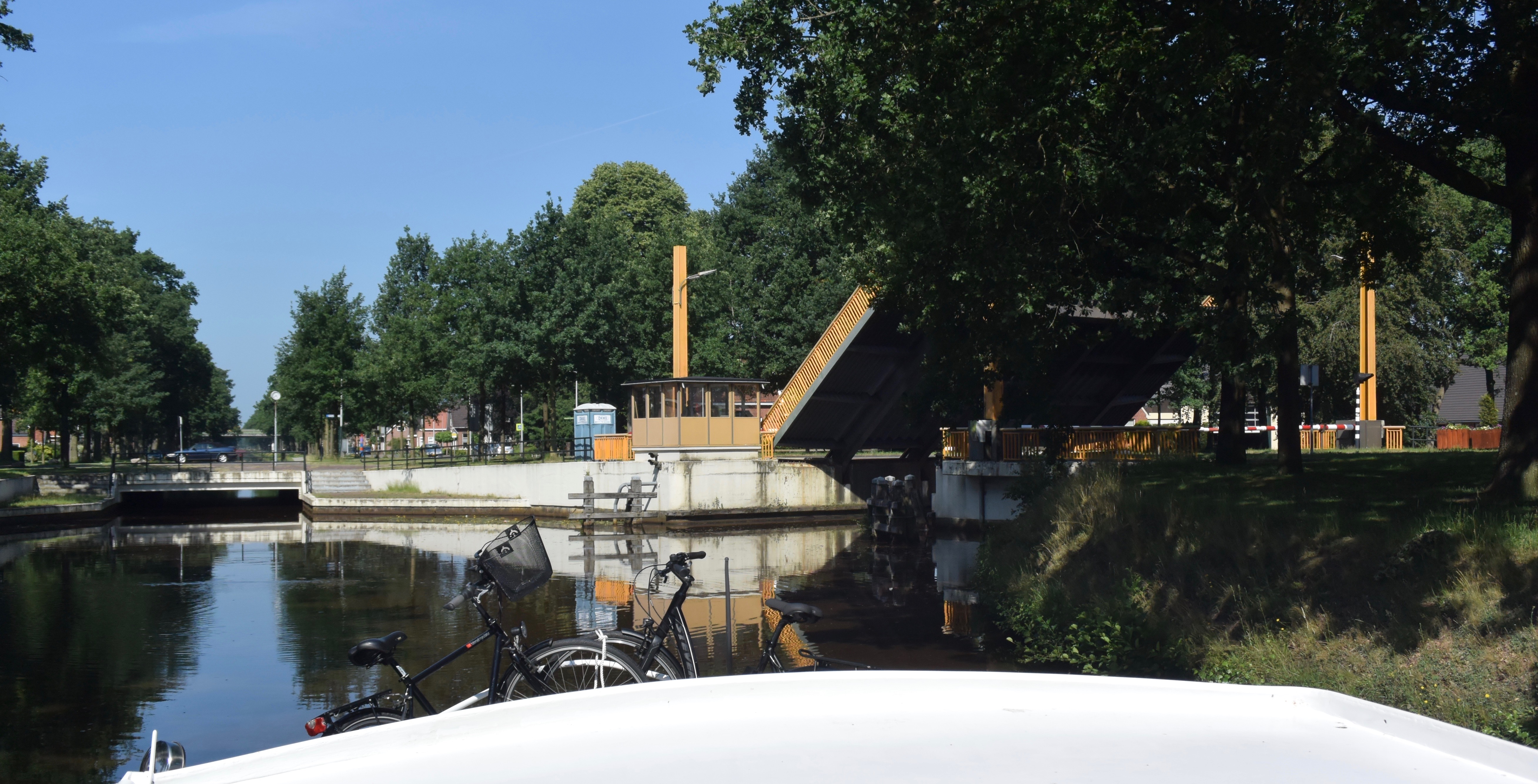 Wenn man am ersten Durchgang des Tages am „betreuten Kanalfahren“ teilnehmen möchte, muss man/frau früh aufstehen. 6.45. Der erste Ruf am „Hier-melden-Schalter“ pünktlich um 8.00 hat verzögerten Erfolg. Die Schleusenwärter tauchen knapp zwanzig Minuten später mit ihren kleinen Motorrollern auf und fragen freundlich nach der Strecke. „Zuidlaarder Meer“ (nordwärts) oder „Veendam“ (ostwärts)? Wir wollen in den Norden und sind die ersten und einzigen(!) für die frühe Passage (es gibt nur 4 pro Tag).
