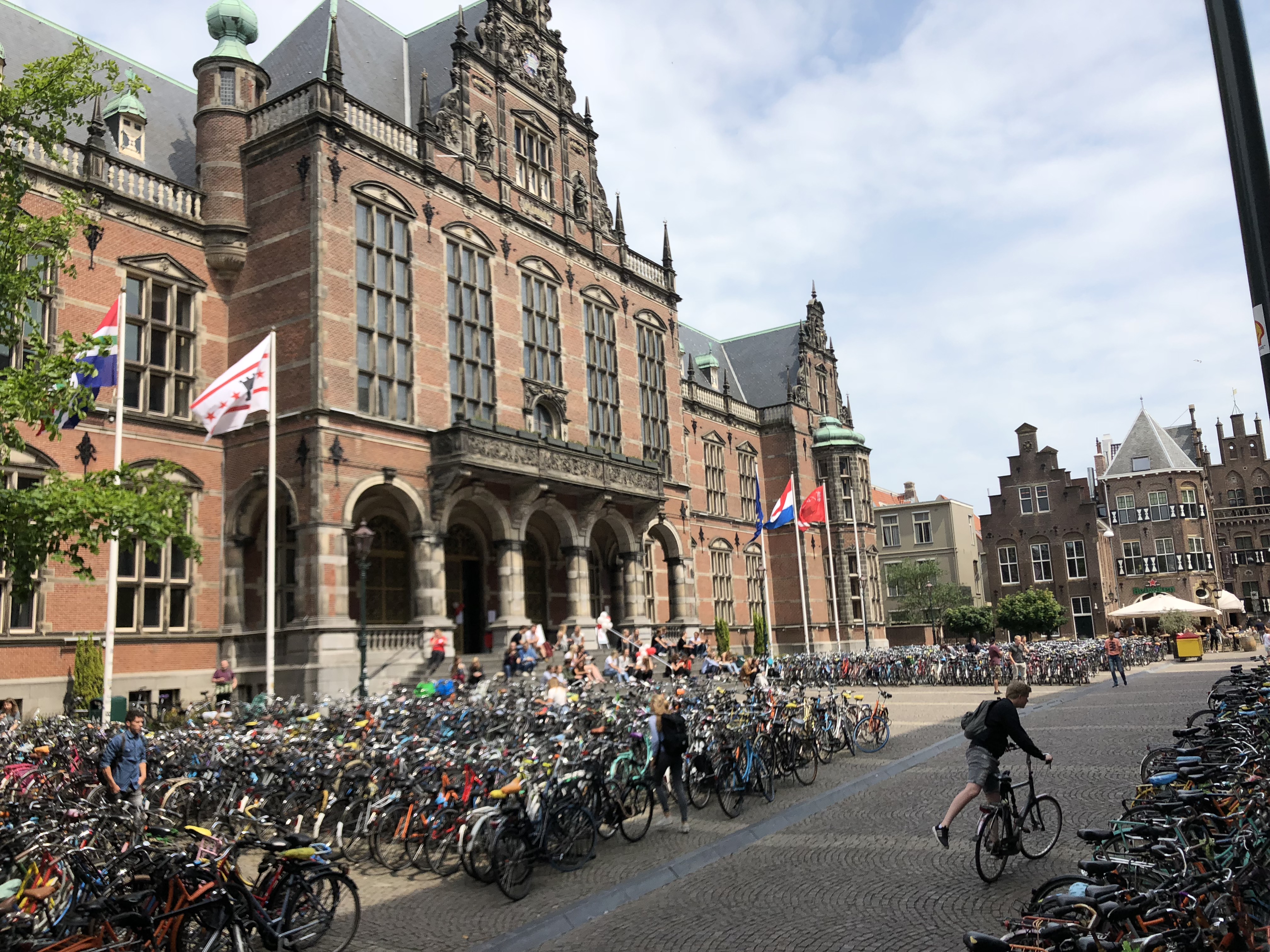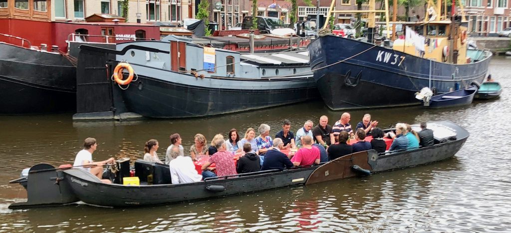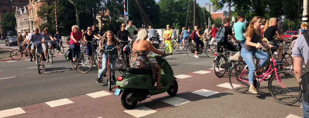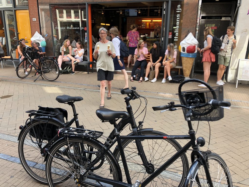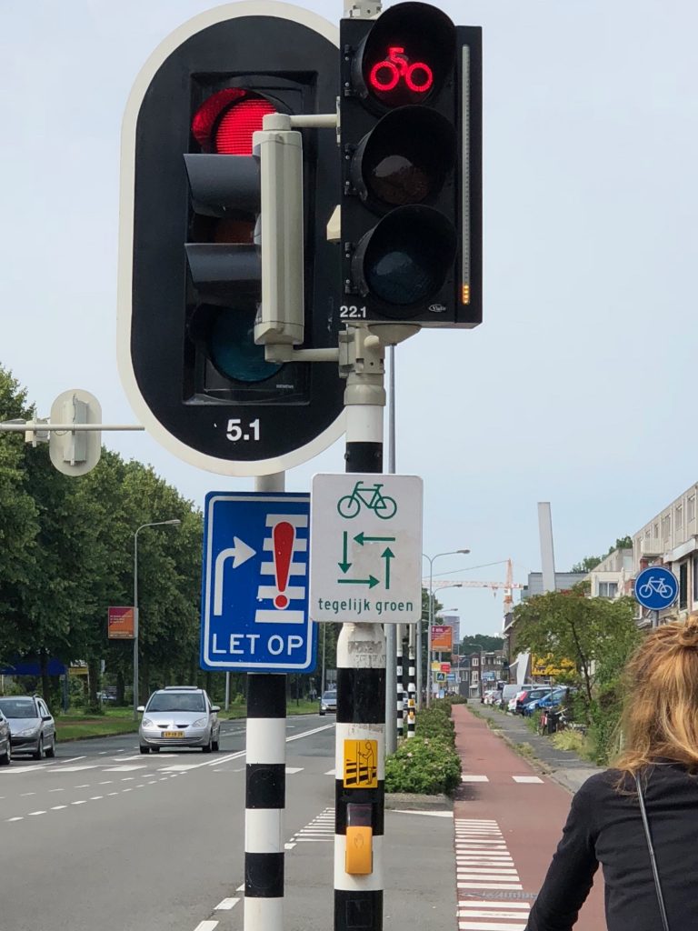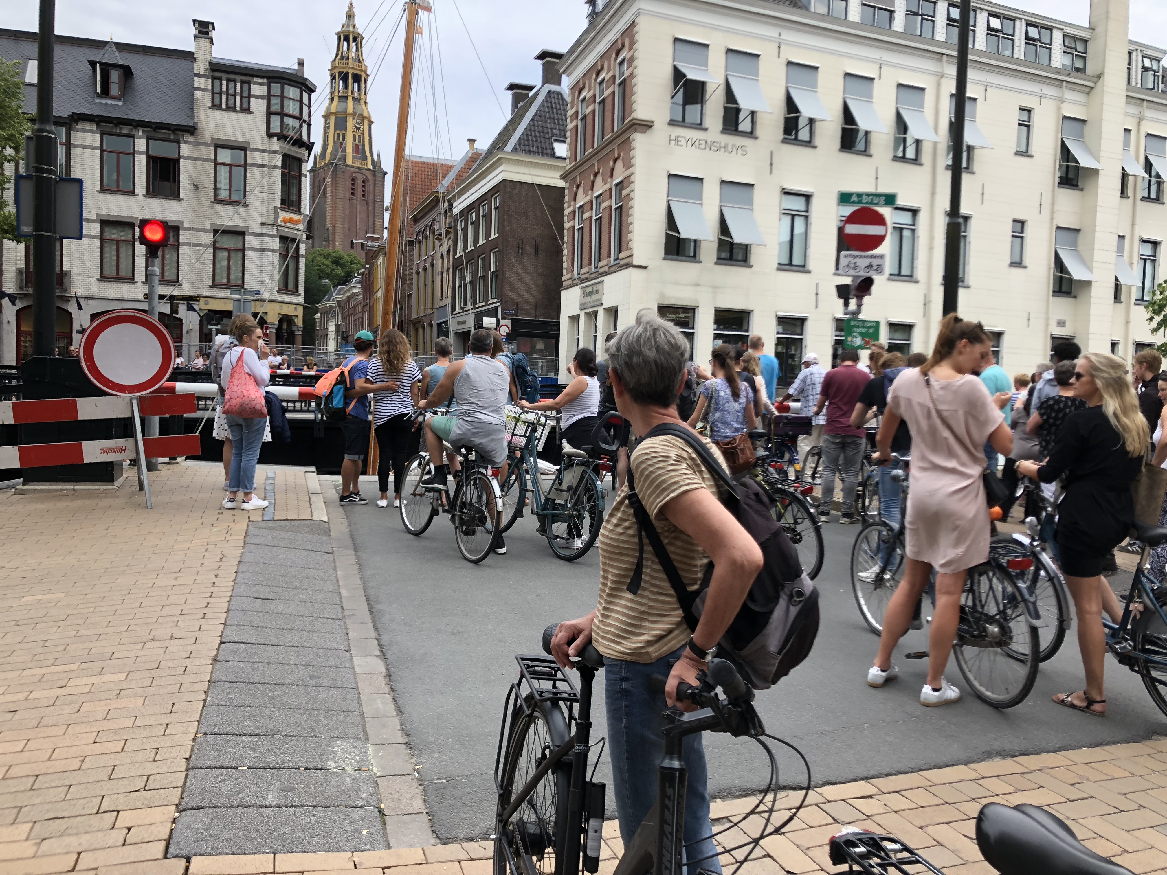 Groningen, Haupstadt gleichnamiger Provinz, hat 200.000 Einwohner (50.000 davon Studenten) und einen Radverkehrsanteil von 60 %. Auf dem Rückweg zum Hafen hatten wir noch mehrmals die Gelegenheit, das turbulente Chaos zu bestaunen. An Ampeln fahren die „Fietsen“ (nach den Autos) alle auf Kommando gleichzeitig los (aus allen Richtungen!). Je nach Temperament nicht immer nach der Regel, dass der jeweils rechte Pulk Vorfahrt hat. Wir kamen aus dem Staunen nicht mehr raus, dass es null Zusammenstöße gab. Ich werde morgen mal das dazu passende Verkehrsschild fotografieren.